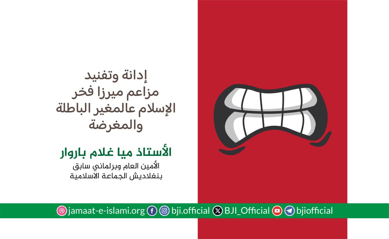 صدر الأمين العام للجماعة الإسلامية في بنغلاديش وعضو البرلمان السابق، الأستاذ ميـا غلام بروار، اليوم الثلاثاء 23 سبتمبر 2025م، بيانا عبر فيه عن بالغ استنكاره للتصريحات الباطلة التي نشرت تحت عنوان: «الجماعة تضغط على حزب بنغلاديش الوطني لعدم منحها 30 مقعدا عبر نظام التمثيل النسبي، والتي نسبت إلى الأمين العام لحزب بنغلاديش الوطني السيد ميرزا فخر الإسلام عالمغير