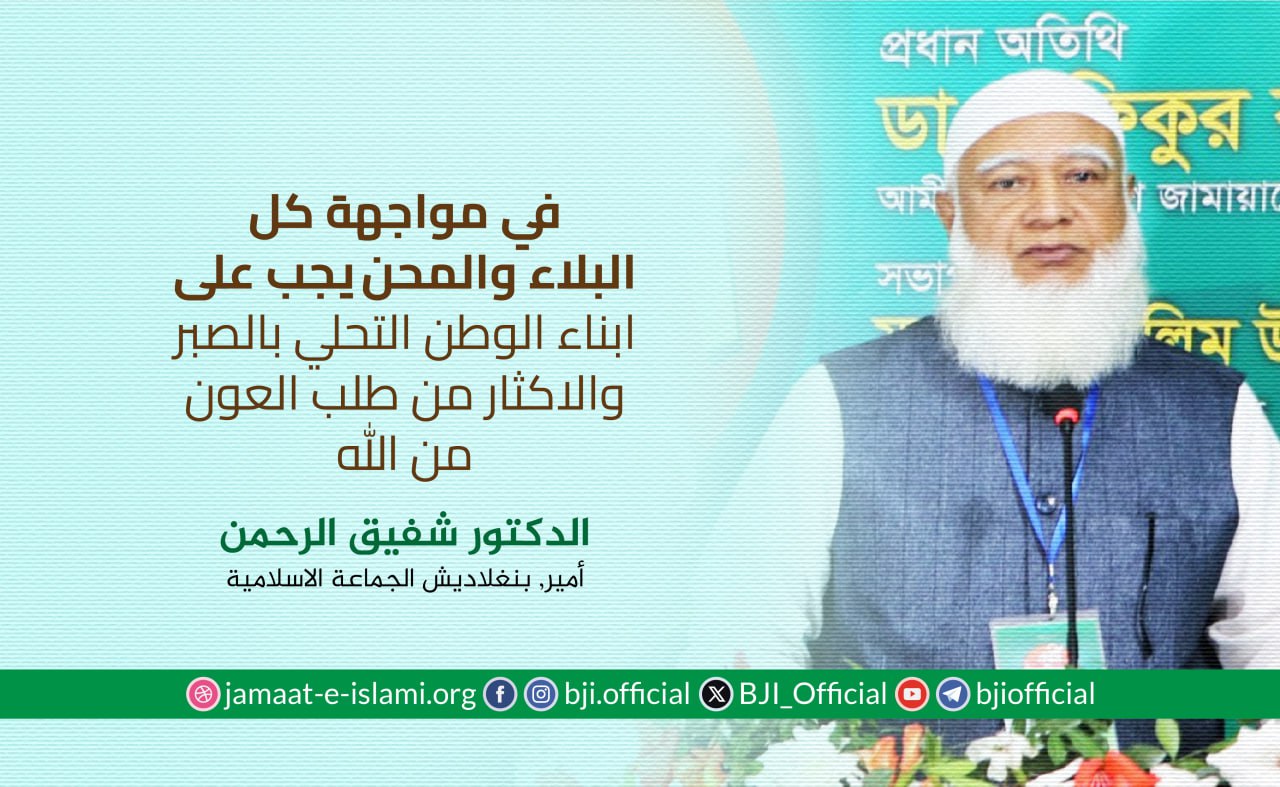 أصدرأميرالجماعةالإسلامية،الشيخالدكتورشفيقالرحمن اليوم السبت الموافق لـ 12 فبراير 2022 بيانا أدان فيه بشدة قيام الحكومة باعتقال الأمين العام للجماعة الإسلامية والنائب ...