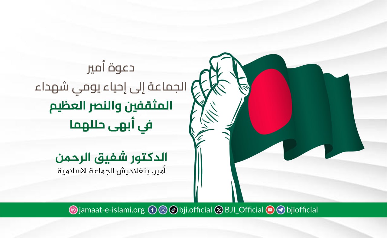 وأردف قائلا، وانطلاقا من عهد لا يتزعزع بصون استقلال البلاد وسيادتها، وترسيخ حقوق الإنسان وكرامته، أدعو جميع فروع الجماعة الإسلامية، ومعها جماهير شعبنا الكريم، إلى إحياء يومي شهداء المثقفين والنصر العظيم عبر الندوات والمسيرات ورفع الأكف بالدعاء، بما يليق بجلال المناسبة وعظمة الرسالة. كما أتقدم، بمناسبة يوم النصر العظيم، بأصدق التهاني وأزكى التبريكات إلى أبناء شعبنا، مبتهلا إلى الله أن يفيض على وطننا نعمه، وأن يكلله بالأمن والرخاء والازدهار