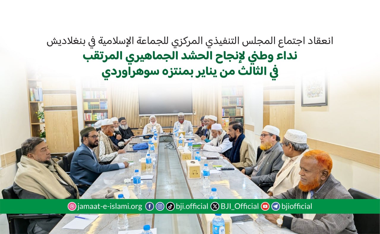 وفي ختام الاجتماع، وجهت الجماعة نداء صادقا إلى جماهير الشعب بمختلف أطيافها، دعتهم فيه إلى التوحد والتكاتف من أجل خير الوطن والأمة، وإرساء دعائم العدل والحق، والسعي لبناء بنغلاديش الغد دولة يسودها السلام وتتحقق فيها قيم الرفاه والكرامة الإنسانية. وفي هذا السياق، حثت الجماعة أبناء الوطن كافة على المشاركة الواسعة والعمل الجاد لإنجاح الحشد الجماهيري المقرر عقده يوم السبت الثالث من يناير في منتزه سوهراوردي بالعاصمة دكا