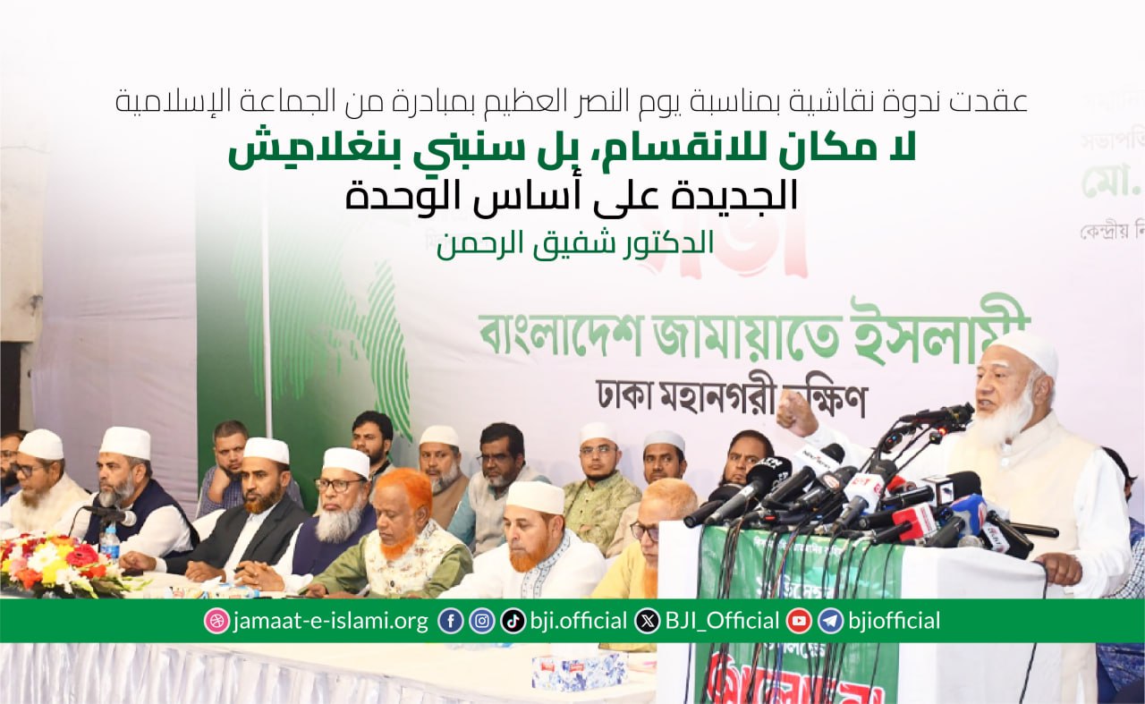 جاء ذلك في كلمته بوصفه الضيف الرئيس في الندوة الفكرية التي نظمتها الجماعة الإسلامية في دكا الجنوبية بمناسبة يوم النصر العظيم، يوم الاثنين (15 ديسمبر)، في قاعة نادي الصحافة الوطنية. واستهل كلمته باستحضار مهيب لتضحيات أبطال حرب التحرير عام 1971، مستذكرا إياهم بإجلال بالغ، ومؤكدا أن هؤلاء الأبطال خلصوا الأمة البنغلاديشية من نير الظلم والاستبداد الأجنبي. وأضاف أن مقاتلي ثورة يوليو 2024 أنقذوا الأمة من قبضة الفاشية، وفتحوا أمامها أفق الحرية من جديد