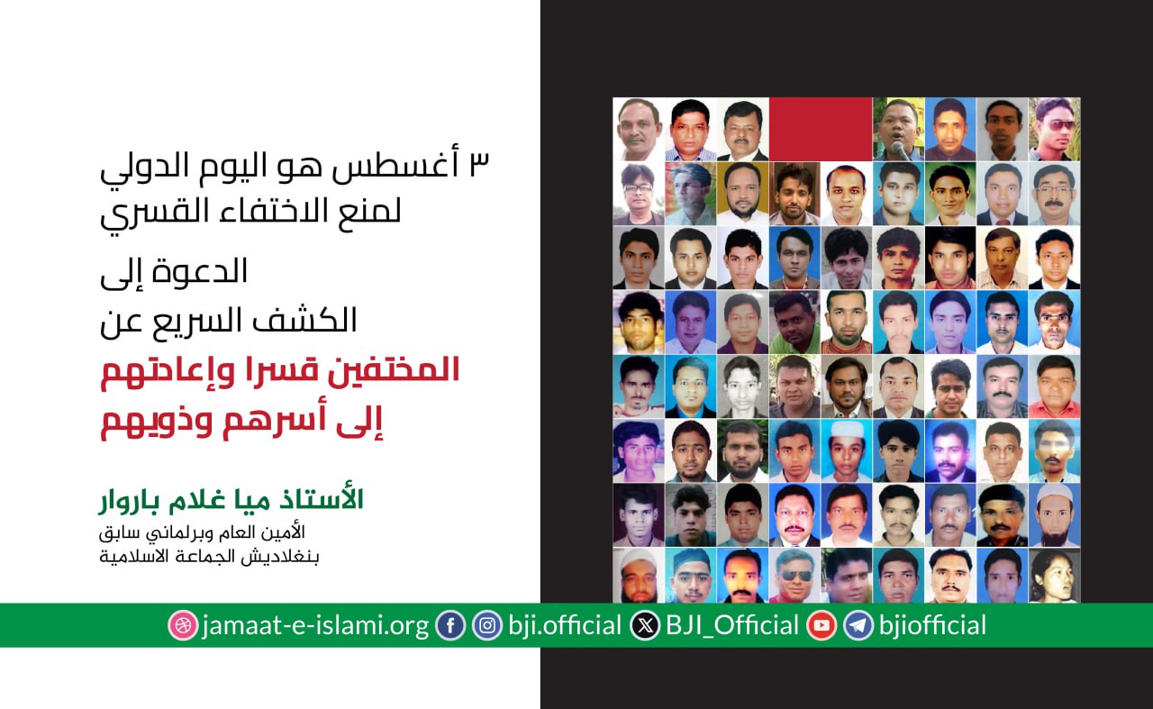 بمناسبة حلول اليوم الدولي لضحايا الإخفاء القسري الموافق للثلاثين من أغسطس، أصدر الأمين العام للجماعة الإسلامية في بنغلاديش وعضو البرلمان السابق الأستاذ ميا غلام بروار بيانا في التاسع والعشرين من أغسطس