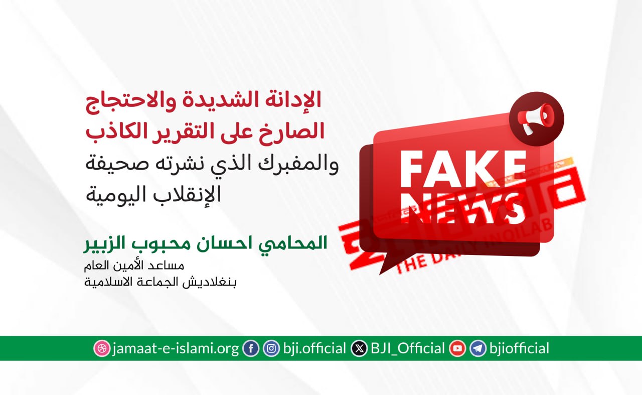 أصدر مساعد الأمين العام للجماعة الإسلامية في بنغلاديش ورئيس دائرة الإعلام والدعاية المركزية، المحامي إحسان الحق محبوب زبير، اليوم الاثنين 16 سبتمبر، بيانا شديد اللهجة استنكر فيه التقرير الباطل الذي نشرته صحيفة الإنقلاب في صدر صفحتها الأولى تحت عنوان الجماعة تنزل إلى الميدان بأجندة هندية، واعتبره محض افتراء مردود، وتلفيق رخيص مسيس، لا غرض له سوى النيل من الحقيقة وتشويه المواقف الوطنية