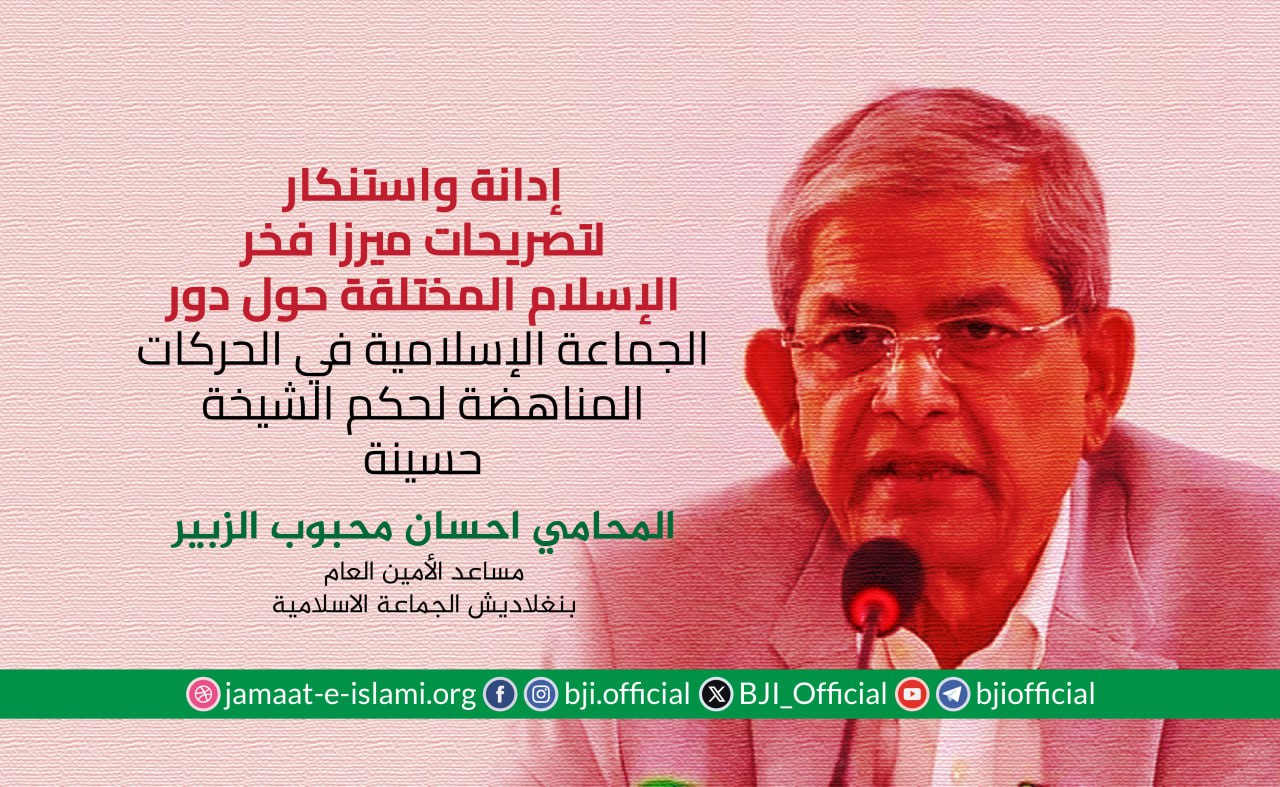 أصدر مساعد الأمين العام للجماعة الإسلامية في بنغلاديش ورئيس دائرة الإعلام والدعاية المركزية المحامي إحسان الحق محبوب زبير بتاريخ 22 نوفمبر بيانا أدان فيه واستنكر بشدة التصريحات التي أدلى بها الأمين العام لحزب بنغلاديش الوطني ميرزا فخر الإسلام عالمغير خلال مناسبة عقدت في العاصمة دكا حيث زعم فيها أن الجماعة الإسلامية لم يكن لها أي دور في الحركات المناهضة للشيخة حسينة خلال السنوات العشر الماضية