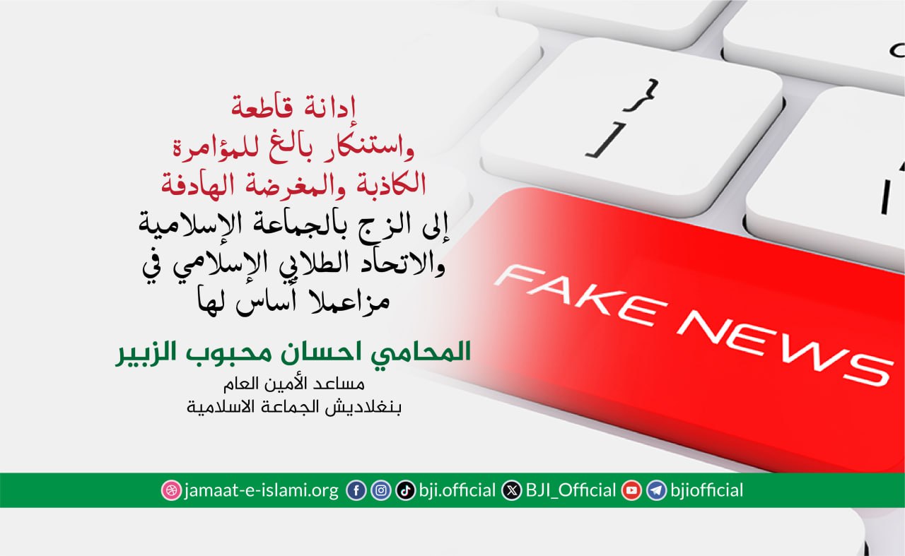 وتابع قائلا: وفي هذا المقام، نود أن نؤكد تأكيدا قاطعا أن موقف الجماعة الإسلامية في بنغلادش من قضية السلامة الإقليمية لأي دولة هو موقف مبدئي ثابت لا يقبل المساومة. وإن أي محاولة لربط الجماعة الإسلامية أو الاتحاد الطلابي الإسلامي بتصريحات تمس وحدة أي بلد أو سيادته الإقليمية إنما هي افتراء محض، وكذب مكشوف، وجزء من مؤامرة محسوبة الأهداف. وعليه، فإننا نطالب جميع الجهات المعنية بوقف هذه الحملات التضليلية والأكاذيب الممنهجة فورا ودون إبطاء