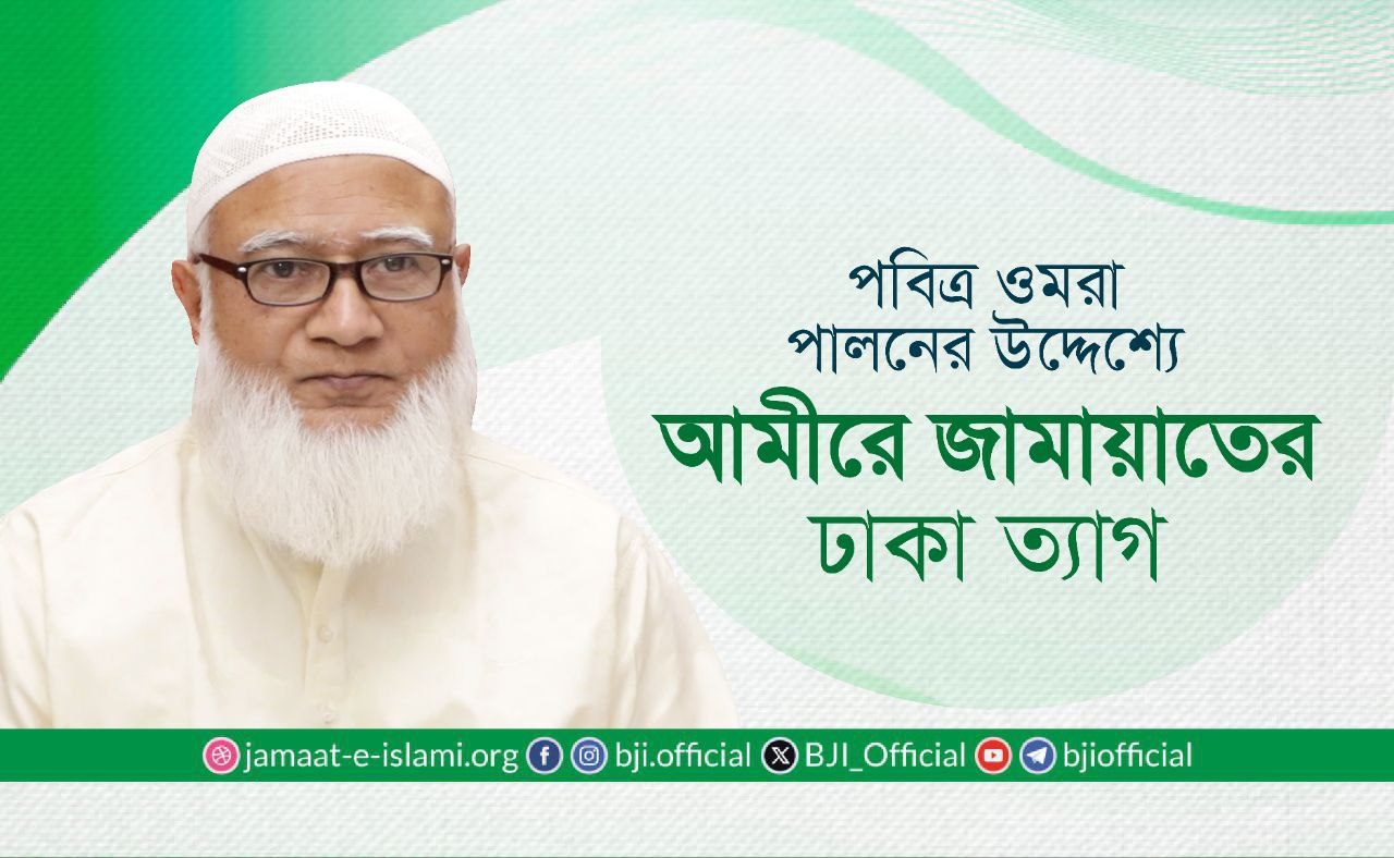 বাংলাদেশ জামায়াতে ইসলামী’র সম্মানিত আমীর ডা. শফিকুর রহমান পবিত্র মক্কায় ওমরা পালন করার উদ্দেশ্যে আজ ১৯ অক্টোবর বেলা ১১টায় ঢাকা ত্যাগ করেছেন। এ সময় তাঁকে হযরত শাহজালাল আন্তর্জাতিক বিমানবন্দরে বিদায় জানান বাংলাদেশ জামায়াতে ইসলামীর সেক্রেটারি জেনারেল সাবেক এমপি অধ্যাপক মিয়া গোলাম পরওয়ার, সহকারী সেক্রেটারি জেনারেল মাওলানা আবদুল হালিম ও এড. এহসানুল মাহবুব জুবায়ের এবং কেন্দ্রীয় নির্বাহী পরিষদ সদস্য, ঢাকা মহানগরী উত্তরের আমীর জনাব মোঃ সেলিম উদ্দিন।