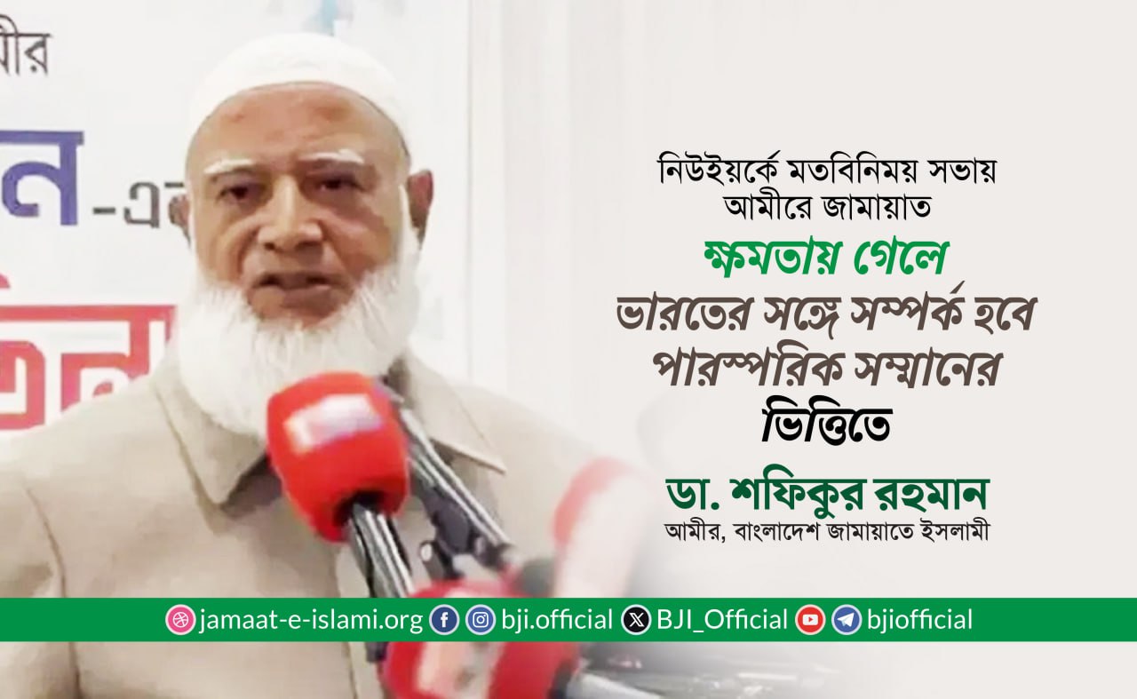 ২২ অক্টোবর (বুধবার) স্থানীয় সময় সন্ধ্যায় আমীরে জামায়াত ডা. শফিকুর রহমান সপ্তাহব্যাপী যুক্তরাষ্ট্র সফরের প্রথম দিন নিউইয়র্কে আয়োজিত এক মতবিনিময় সভায় অংশগ্রহণকালে ভারতের সঙ্গে সম্পর্ক বিষয়ে সাংবাদিকদের এক প্রশ্নের জবাবে তিনি এসব কথা বলেন।