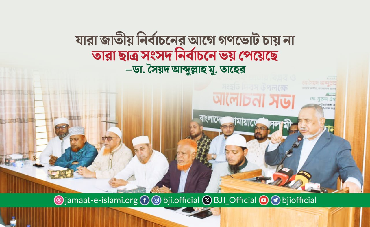 বাংলাদেশ জামায়াতে ইসলামীর নায়েবে আমীর ও সাবেক এমপি ডা. সৈয়দ আব্দুল্লাহ মোহাম্মদ তাহের বলেছেন, যারা জাতীয় নির্বাচনের আগে গণভোট চায় না তারা ডাকসু নির্বাচনে ভয় পেয়েছে। ঢাকা বিশ্ববিদ্যালয় কেন্দ্রীয় ছাত্র সংসদ (ডাকসু) নির্বাচনের পরাজয়ের পর তারা জাকসু, চাকুস, রাকসু নির্বাচন বন্ধে কত শত ষড়যন্ত্র করেছে তা শিক্ষার্থীর পাশাপাশি দেশবাসীও দেখেছে। তারা বুঝতে পারছে জাতীয় নির্বাচনের আগে যদি স্থানীয় সরকার নির্বাচন হয় তাহলে পরাজয়ের ভরাডুবি খেতে হবে। সেজন্য তারা জাতীয় নির্বাচনে আগে স্থানীয় সরকার নির্বাচনের যেভাবে বিরোধিতা করেছে একইভাবে গণভোটের বিরোধিতা করছে।