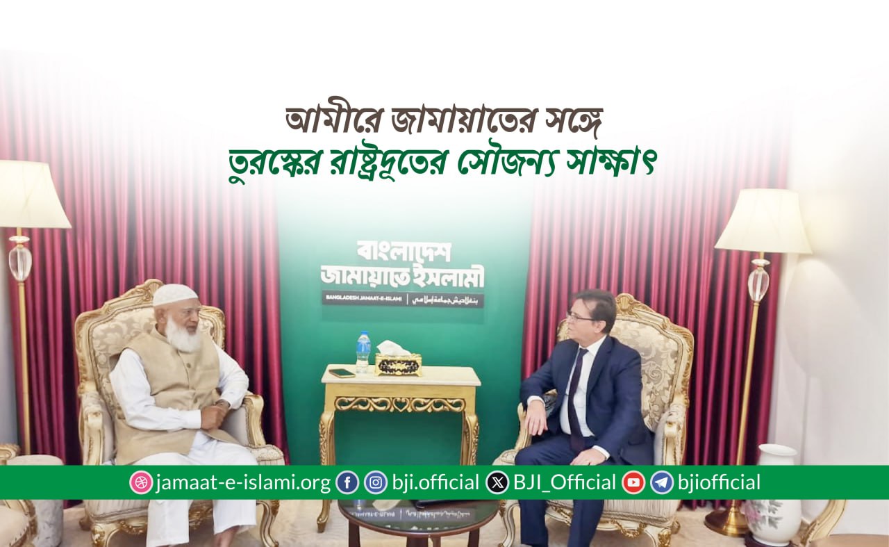 ১৬ নভেম্বর বাংলাদেশ জামায়াতে ইসলামীর আমীর ডা. শফিকুর রহমানের সঙ্গে ঢাকাস্থ তুরস্ক দূতাবাসের মান্যবর রাষ্ট্রদূত মি. রামিস সেন এক সৌজন্য সাক্ষাতে মিলিত হন। রবিবার সকালে রাজধানীর বসুন্ধরাস্থ আমীরে জামায়াতের কার্যালয়ে অনুষ্ঠিত এ সাক্ষাৎকারটি অত্যন্ত আন্তরিক ও সৌহার্দ্যপূর্ণ পরিবেশে অনুষ্ঠিত হয়।