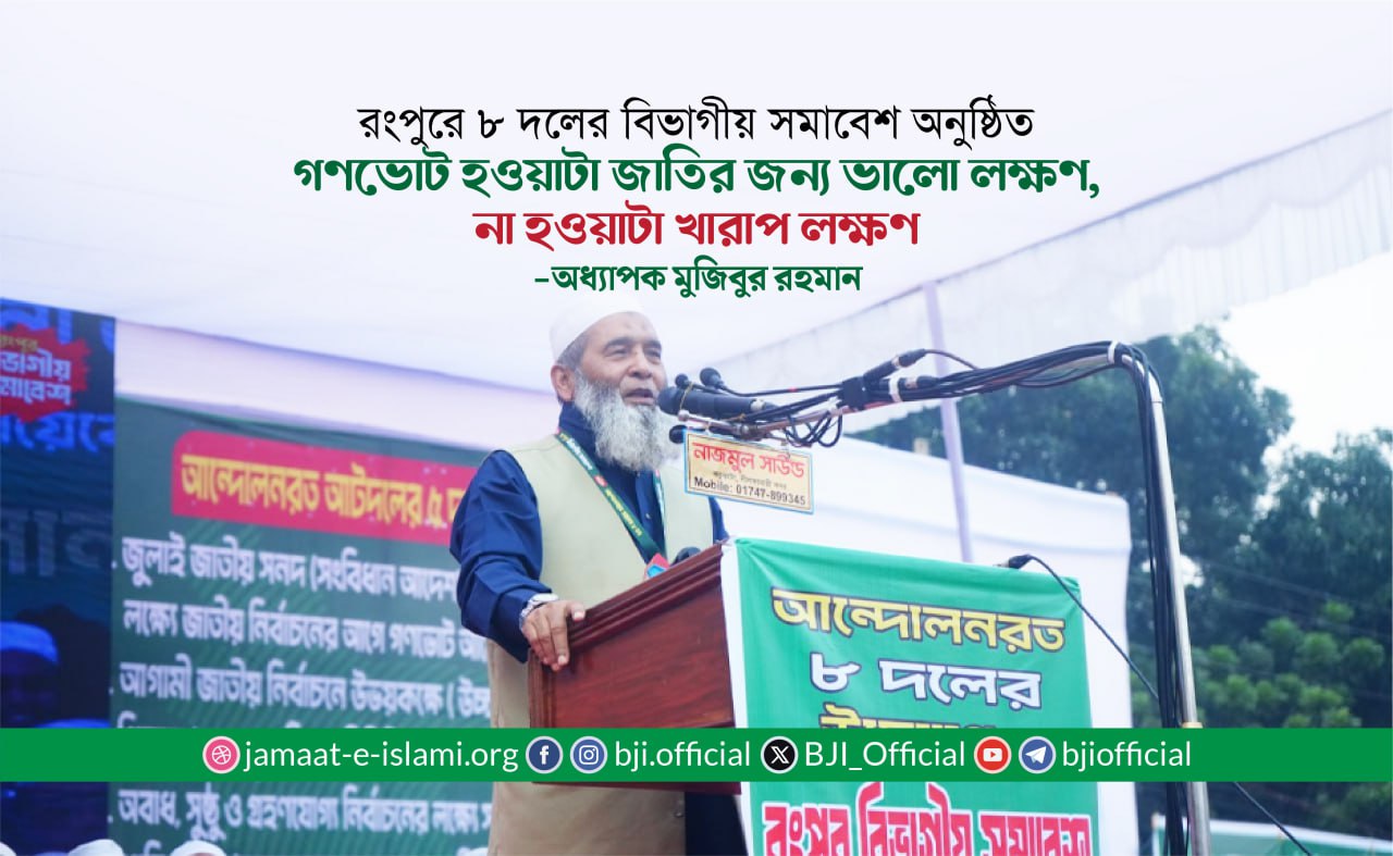 রংপুরে জামায়াতসহ সমমনা আট দলের বিভাগীয় মহাসমাবেশে নির্বাচনের আগে গণভোট আয়োজনের দাবি তুলেছেন দলগুলোর শীর্ষ নেতারা। সমাবেশে বক্তারা বলেছেন দেশে চলমান রাজনৈতিক সংকট, নির্বাচনব্যবস্থার আস্থাহীনতা এবং বিগত তিনটি জাতীয় নির্বাচনের অনিয়মের সমাধান ও জনগণের সংস্কার আকাঙ্ক্ষা বাস্তবায়ন গণভোট ছাড়া সম্ভব নয়।