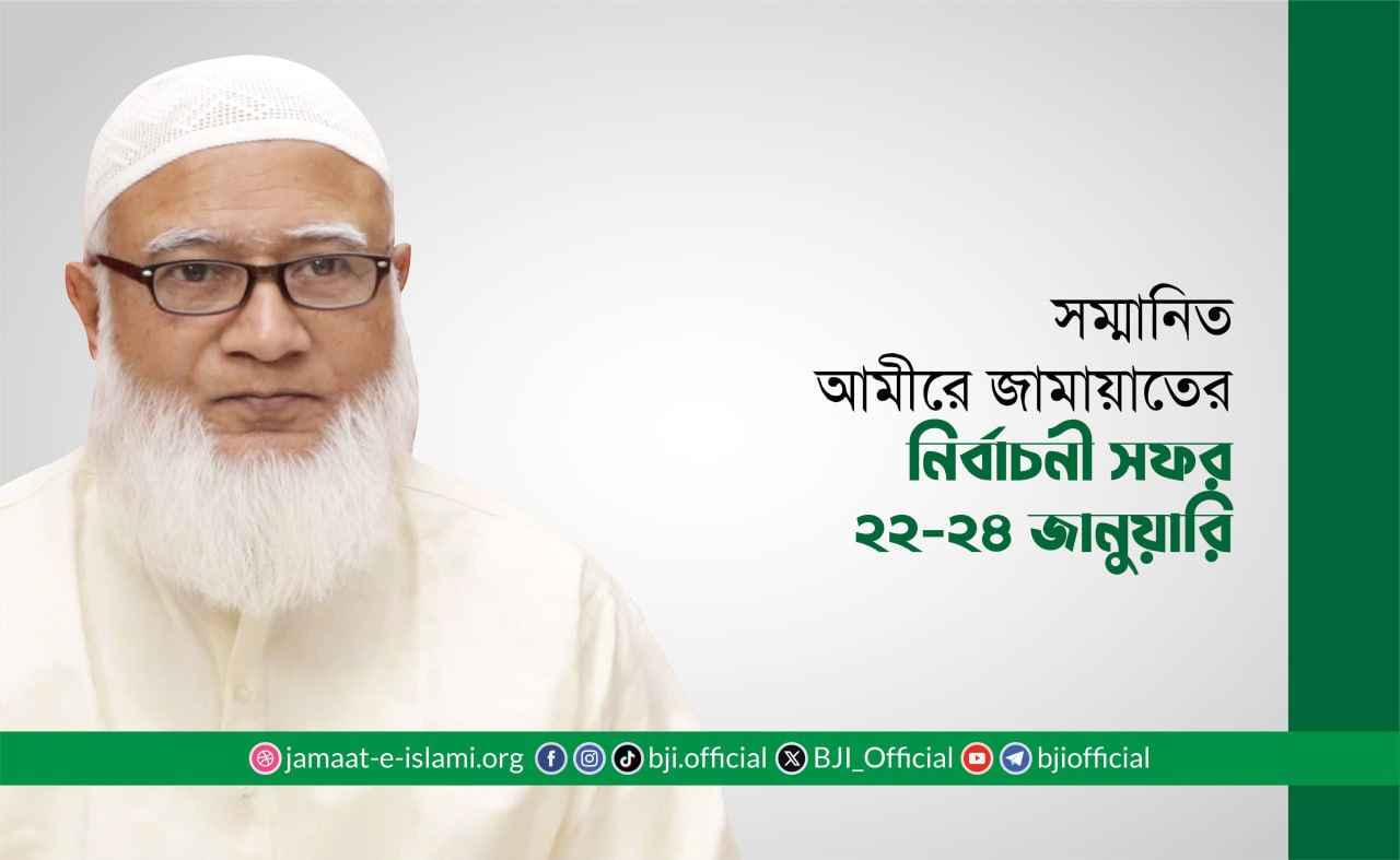 আমীরে জামায়াত ২২ জানুয়ারি তার নির্বাচনী এলাকা ঢাকা-১৫ তে গণসংযোগ করবেন ও নির্বাচনী জনসভায় বক্তব্য রাখবেন। ২৩ জানুয়ারি (জুমআ বার) বেলা ২টায় দিনাজপুর জেলা জামায়াত আয়োজিত স্থানীয় গোর-ই-শহীদ ময়দানে, বিকাল ৪টায় ঠাকুরগাঁয়ে এবং সন্ধ্যায় বিভাগীয় শহর রংপুরে আয়োজিত জনসভায় প্রধান অতিথি হিসেবে বক্তব্য রাখবেন।