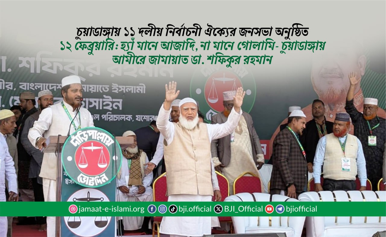 ত্রয়োদশ জাতীয় সংসদ নির্বাচন উপলক্ষে আজ সোমবার, ২৬ ফেব্রুয়ারি, চুয়াডাঙ্গা টাউন ফুটবল মাঠে ১১ দলীয় নির্বাচনী ঐক্যের এক জনসভায় প্রধান অতিথির বক্তব্যে ডা. শফিকুর রহমান এসব কথা বলেন।