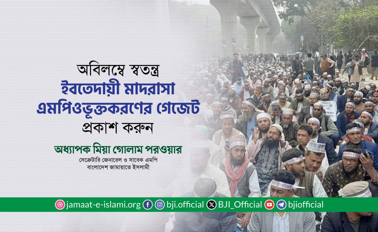অধ্যাপক মিয়া গোলাম পরওয়ার অবিলম্বে স্বতন্ত্র ইবতেদায়ী মাদরাসা এমপিওভূক্তকরণের গেজেট প্রকাশ করার আহবান জানিয়ে বাংলাদেশ জামায়াতে ইসলামীর সেক্রেটারি জেনারেল সাবেক ...