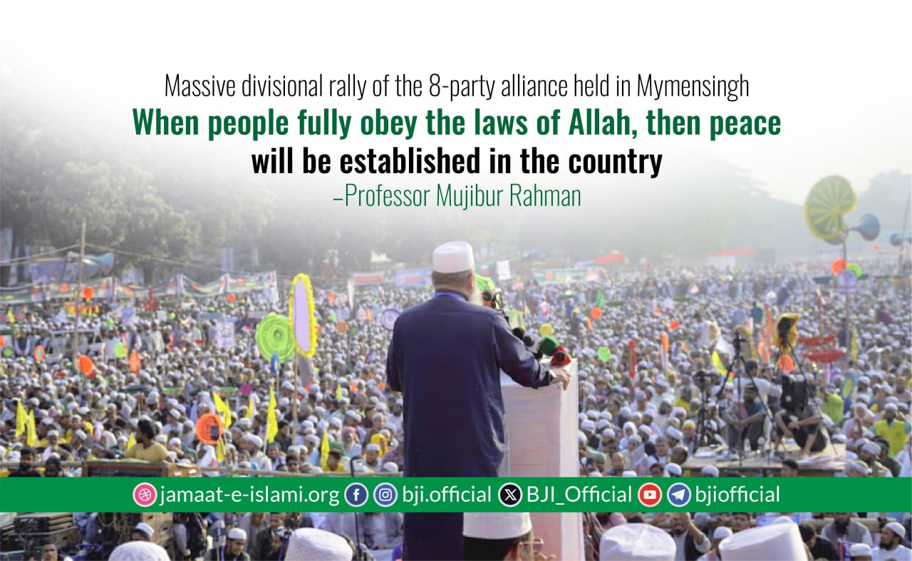 Under the presidency of Presidium Member of Islami Andolan Bangladesh, Professor Ashraf Ali Akhon, and hosted by Secretary of Mymensingh District Jamaat, Maulana Mozammel Haque Akand, the chief guest and Nayeb-e-Ameer of Bangladesh Jamaat-e-Islami, Professor Mujibur Rahman said: “The suffering and hardship of the people have not ended. The people of Bangladesh have spent 54 years in great difficulty. We want to change the fate of the people of Bangladesh. From now on, the National Parliament of Bangladesh, the Secretariat, and all educational institutions will be run only by the laws of Allah. No anti-Islamic law will be allowed here. Allah has given us two hands. So, with these hands, will we stamp in favor of man-made laws, or in favor of Allah’s law? We are pledging that as long as we live, we will live with the law of Allah, Insha Allah. We are the 8 parties—those who are Islam-oriented, who want the welfare of the country, patriotic manpower and patriotic parties—we have formed the 8-party alliance. The 8-party alliance stands for Islamic law.