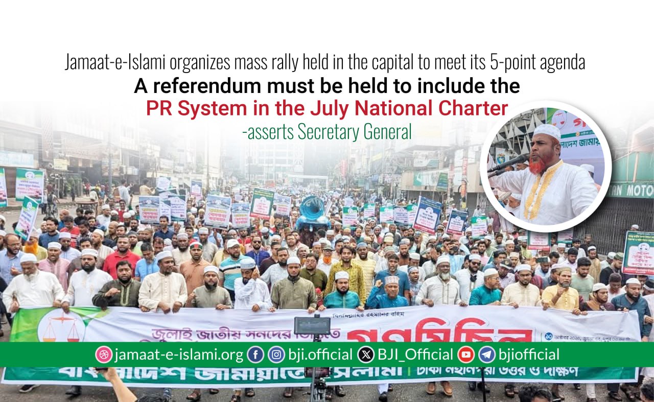 Bangladesh Jamaat-e-Islami’s Secretary General and former Member of Parliament Professor Mia Golam Porwar said that a referendum must be held to include the Proportional Representation (PR) system in the July National Charter. Jamaat-e-Islami will accept whatever decision the people give through that referendum. The PR system is a popular electoral method across the world, where every vote is duly valued. There is no scope for any voter’s opinion to be disregarded, he added.