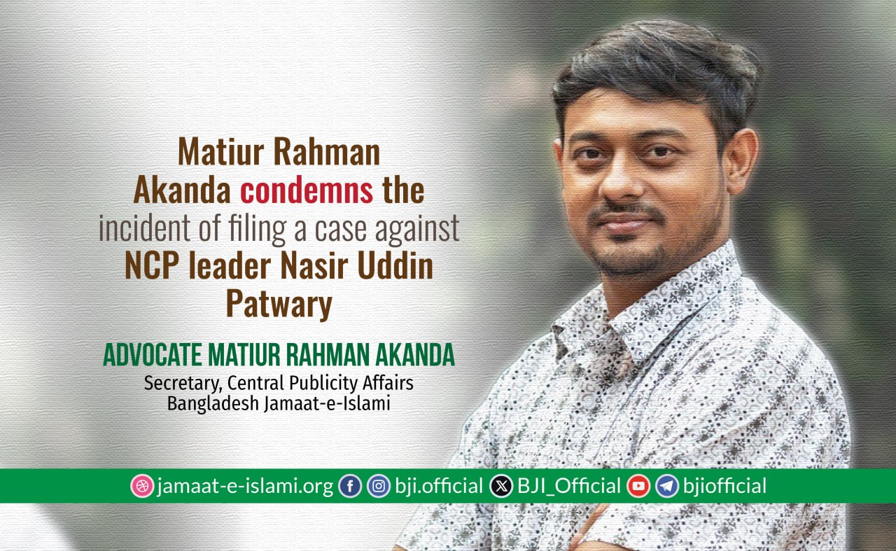 Bangladesh Jamaat-e-Islami’s Central Executive Committee Member and Secretary of it’s Central Publicity and Media Department, Advocate Matiur Rahman Akanda issued the following statement on November 3, 2025 expressing condemnation and protest over the filing of a case against the July Warrior and Chief Coordinator of NCP, Nasir Uddin Patwary.