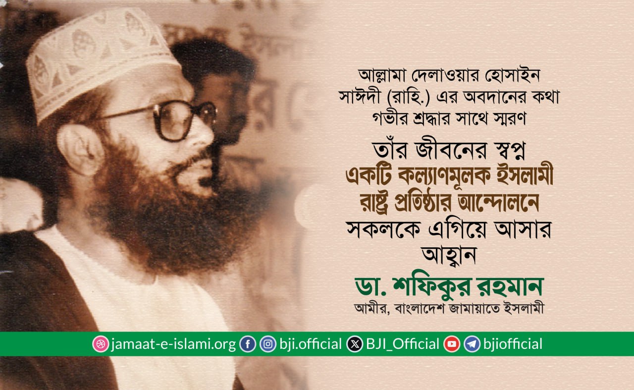বাংলাদেশ জামায়াতে ইসলামীর সাবেক নায়েবে আমীর, আন্তর্জাতিক খ্যাতিসম্পন্ন ইসলামী চিন্তাবিদ ও মুফাসসিরে কুরআন আল্লামা দেলাওয়ার হোসাইন সাঈদীর অবদানের কথা স্মরণ করে বাংলাদেশ জামায়াতে ইসলামীর আমীর ডা. শফিকুর রহমান ১৪ আগস্ট নিম্নোক্ত বিবৃতি প্রদান করেছেন:-