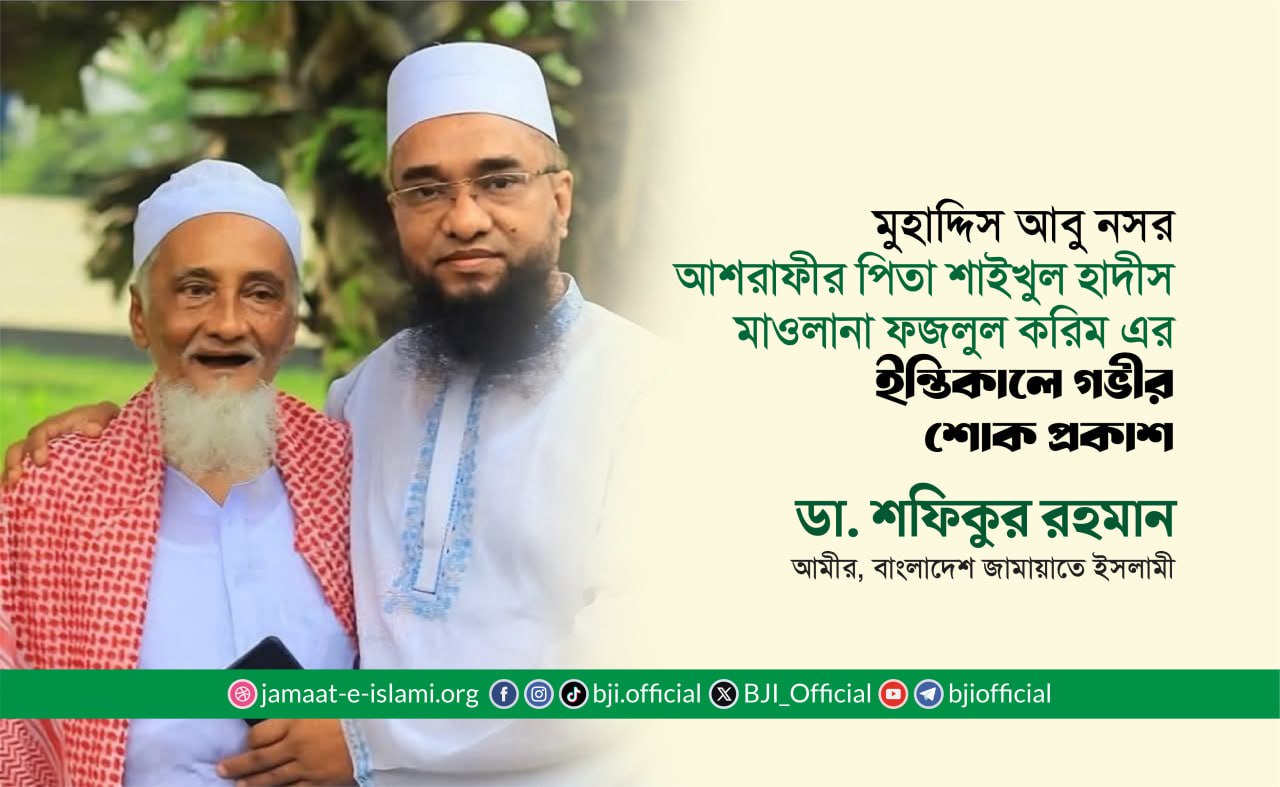 জুলাই যোদ্ধা শফিকুল ইসলামের ইন্তিকালে গভীর শোক প্রকাশ করে বাংলাদেশ জামায়াতে ইসলামীর আমীর ডা.শফিকুর রহমান আজ ৩১ ডিসেম্বর এক শোক বিবৃতি প্রদান করেছেন।