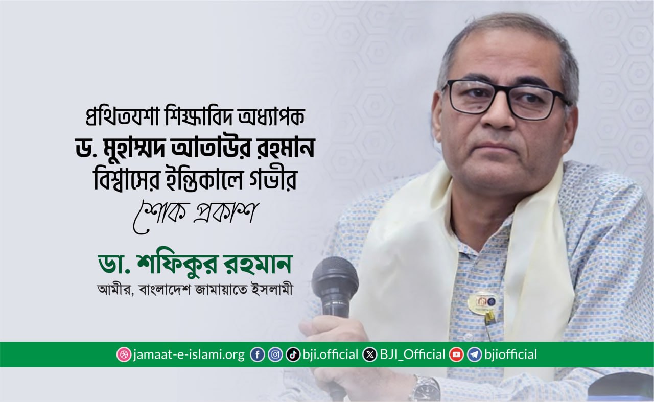 ঢাকা বিশ্ববিদ্যালয়ের কলা অনুষদভুক্ত ইসলামের ইতিহাস ও সংস্কৃতি বিভাগের চেয়ারম্যান, প্রথিতযশা শিক্ষাবিদ অধ্যাপক ড. মুহাম্মদ আতাউর রহমান বিশ্বাস এর ইন্তিকালে গভীর শোক প্রকাশ করে বাংলাদেশ জামায়াতে ইসলামীর আমীর ডা. শফিকুর রহমান আজ ৮ জানুয়ারি এক শোকবাণী প্রদান করেছেন।