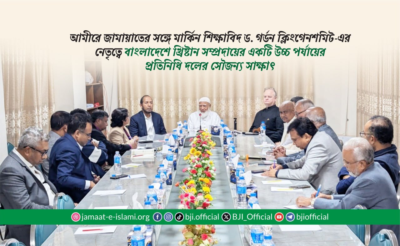 আজ ১৪ জানুয়ারি (বুধবার) সন্ধ্যা ৭টায় ঢাকার মগবাজারস্থ দলের কেন্দ্রীয় কার্যালয়ে বাংলাদেশ জামায়াতে ইসলামীর আমীর ডা. শফিকুর রহমান-এর সঙ্গে মার্কিন শিক্ষাবিদ ড. গর্ডন ক্লিংগেনশমিট-এর নেতৃত্বে বাংলাদেশের খ্রিষ্টান সম্প্রদায়ের ১০ সদস্যের একটি উচ্চপর্যায়ের প্রতিনিধি দল সৌজন্য সাক্ষাৎ করেছেন।