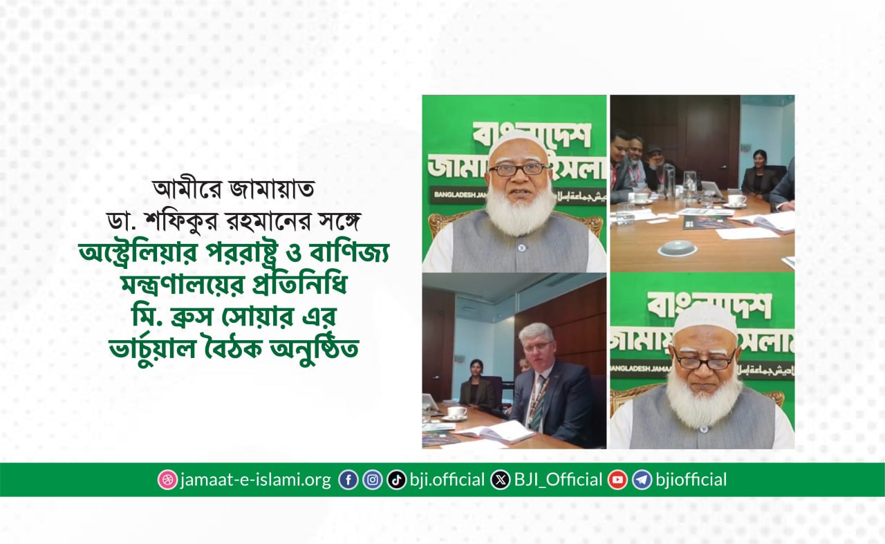 বাংলাদেশ জামায়াতে ইসলামীর আমীর ডা. শফিকুর রহমান অস্ট্রেলিয়ার পররাষ্ট্র ও বাণিজ্য মন্ত্রণালয়ের প্রতিনিধি (অস্ট্রেলিয়া ফরেন এন্ড ট্রেড রিপ্রেজেন্টেটিভ) মি. ব্রুস সোয়ারের সঙ্গে আজ ১৬ জানুয়ারি সকাল ১০.০০টায় এক ভার্চুয়াল বৈঠকে মিলিত হন। অস্ট্রেলিয়ার পক্ষে আরও যুক্ত ছিলেন বাংলাদেশ, শ্রীলংকা ও মালদ্বীপ শাখার সহকারী পরিচালক মিস স্টেসি লি ওয়াকার, বাংলাদেশ শাখা-১ (দ্বিপাক্ষিক) এর সহকারী পরিচালক মিস ব্রুক সিম্পসন এবং বাংলাদেশ শাখা-২ (রোহিঙ্গা) এর সহকারী পরিচালক মিস মিশ খান।
