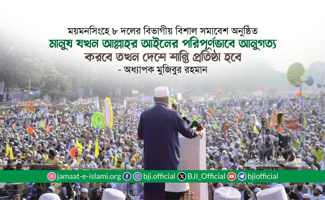 ইসলামী আন্দোলন বাংলাদেশের প্রেসিডিয়াম সদস্য অধ্যাপক আশরাফ আলী আখনের সভাপতিত্বে ও ময়মনসিংহ জেলা জামায়াতের সেক্রেটারি মাওলানা মোজাম্মেল হক আকন্দের সঞ্চালনায় প্রধান অতিথির বক্তব্যে বাংলাদেশ জামায়াতে ইসলামীর নায়েবে আমীর অধ্যাপক মুজিবুর রহমান বলেন, মানুষের দুঃখ–দুর্দশা দূর হয় নাই। অনেক কষ্টে বাংলাদেশের মানুষ ৫৪ বছর কাটিয়েছে। আমরা বাংলাদেশের মানুষের ভাগ্যের পরিবর্তন করতে চাই। আমরা এখন থেকে বাংলাদেশের জাতীয় সংসদসহ সচিবালয়সহ সকল শিক্ষা প্রতিষ্ঠান শুধুমাত্র আল্লাহর আইন দ্বারা পরিচালিত হবে। ইসলামবিরোধী কোনো আইন এখানে চলতে পারবে না। আমাদের হাত দুটি দিয়েছেন আল্লাহ। তাহলে এই হাত দিয়ে আমরা সিল মারবো মানুষের আইনের পক্ষে, না আল্লাহর আইনের পক্ষে? আমরা ওয়াদা করছি, যতদিন বেঁচে থাকবো, আমরা আল্লাহর আইনের সাথেই বেঁচে থাকবো ইনশাআল্লাহ। আমরা ৮ দল — যারা ইসলামপন্থী এবং দেশের কল্যাণ চাই, দেশপ্রেমিক জনশক্তি ও দেশপ্রেমিক দল — আমরা ৮ দল তৈরি করেছি। ৮ দল ইসলামী আইনের পক্ষে।