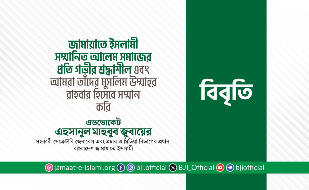 তিনি আরও বলেন, বাংলাদেশ জামায়াতে ইসলামী বরাবরই আলেম সমাজের প্রতি গভীর শ্রদ্ধাশীল। আমরা তাঁদের মুসলিম উম্মাহর রাহবার হিসেবে সম্মান করি। তাঁরা যুগ যুগ ধরে জাতিকে সঠিক দিক-নির্দেশনা দিচ্ছেন এবং ইসলামের আলো ছড়িয়ে দিচ্ছেন। তাঁদের মর্যাদা ক্ষুণ্ন করার মতো কোনো অবস্থান বাংলাদেশ জামায়াতে ইসলামী কখনো গ্রহণ করেনি। সুতরাং এ বিষয়ে বাংলাদেশ জামায়াতে ইসলামীকে বিতর্কিত করার কোনো সুযোগ নেই।”
