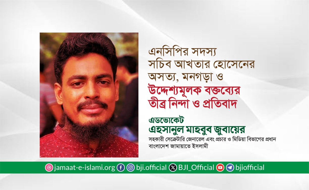 বাংলাদেশ জামায়াতে ইসলামীর বিরুদ্ধে এনসিপির সদস্যসচিব আখতার হোসেনের অসত্য, মনগড়া ও উদ্দেশ্যমূলক বক্তব্যের তীব্র নিন্দা ও প্রতিবাদ জানিয়ে সংগঠনের সহকারী সেক্রেটারি জেনারেল এবং কেন্দ্রীয় প্রচার ও মিডিয়া বিভাগের প্রধান এডভোকেট এহসানুল মাহবুব জুবায়ের আজ ৭ ডিসেম্বর এক বিবৃতি প্রদান করেছেন।