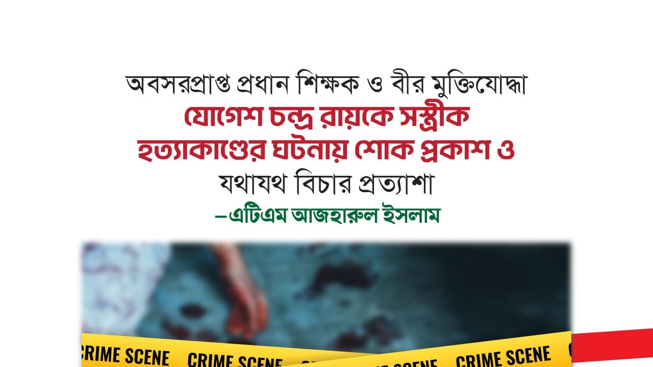 রংপুরের তারাগঞ্জ উপজেলায় অবসরপ্রাপ্ত প্রধান শিক্ষক ও বীর মুক্তিযোদ্ধা যোগেশ চন্দ্র রায়কে সস্ত্রীক হত্যাকাণ্ডের ঘটনায় আজ ৭ ডিসেম্বর শোক প্রকাশ ও যথাযথ বিচার প্রত্যাশা করেছেন বাংলাদেশ জামায়াতে ইসলামীর নায়েবে আমীর এটিএম আজহারুল ইসলাম।