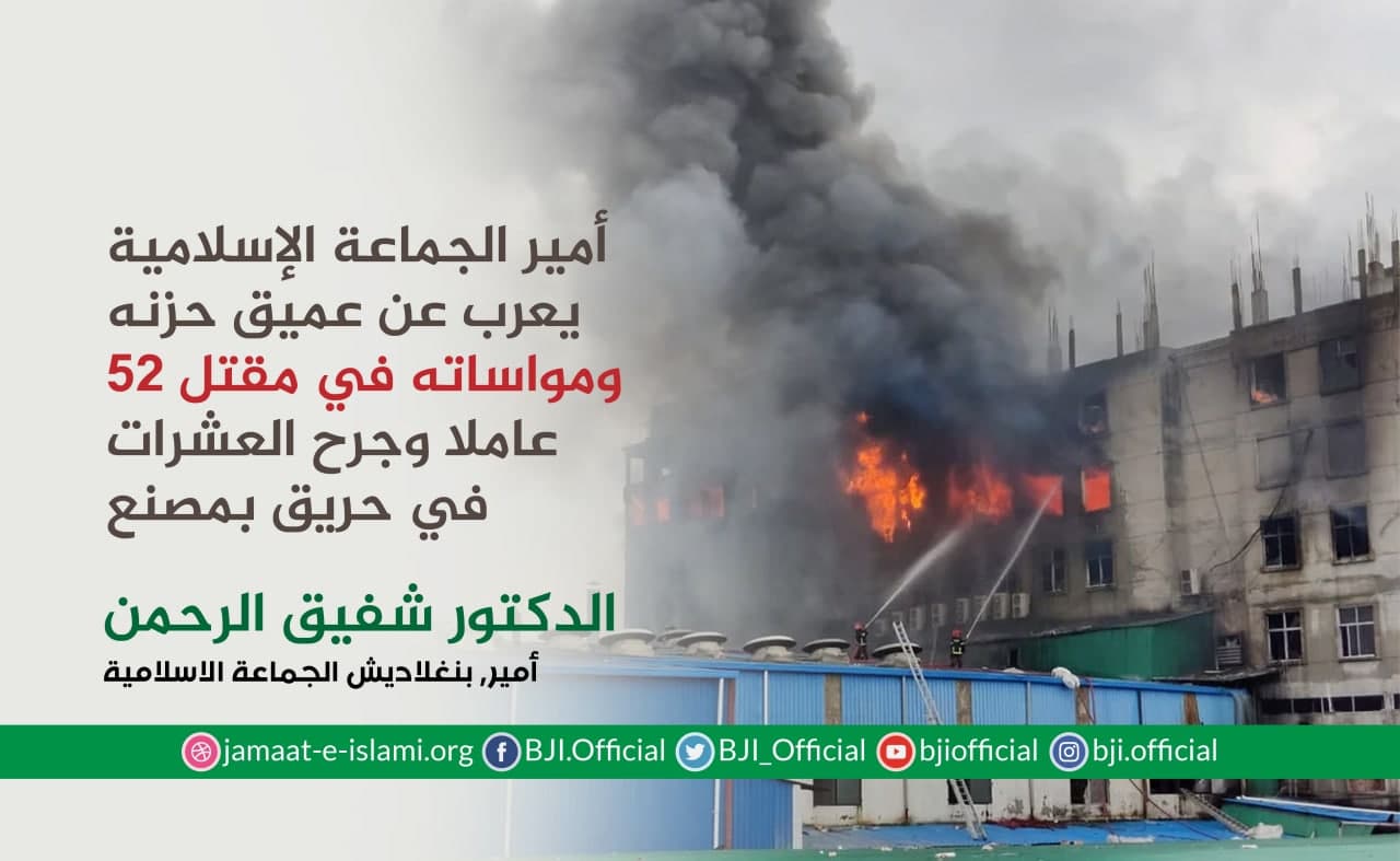 أصدر أمير الجماعة الإسلامية الشيخ الدكتور شفيق الرحمن اليوم الجمعة الموافق لـ9 يوليو 2021 بيانا أعرب فيه عن عميق حزنه ومواساته في مقتل 52 عاملا في حريق اندلع مساء أمس الخميس في مصنع للعصائر في بلدة ربغنج في مدينة"نارانغنج"،مضيفا بأن عددا من الأطفال كانوا برفقة أمهاتهم لقو حتفهم ،مشيرا إلى أن معظم الجثث تفحمت إلى درجة أن أقاربهم لم يتمكنوا من تحديد هوياتهم ،فيما تم نقل العديد من المصابين بحروق بالغة إلى المستشفيات القريبة ،سائلا الله العلي القدير أن يتغمدهم بواسع رحمته،ويسكنهم فسيح جناته،ويلهم أهلهم وذويهم الصبر والسلوان ،متمنيا الشفاء العاجل للمصابين ،مطالبا الحكومة بإجراء تحقيق موسع لمعرفة ...