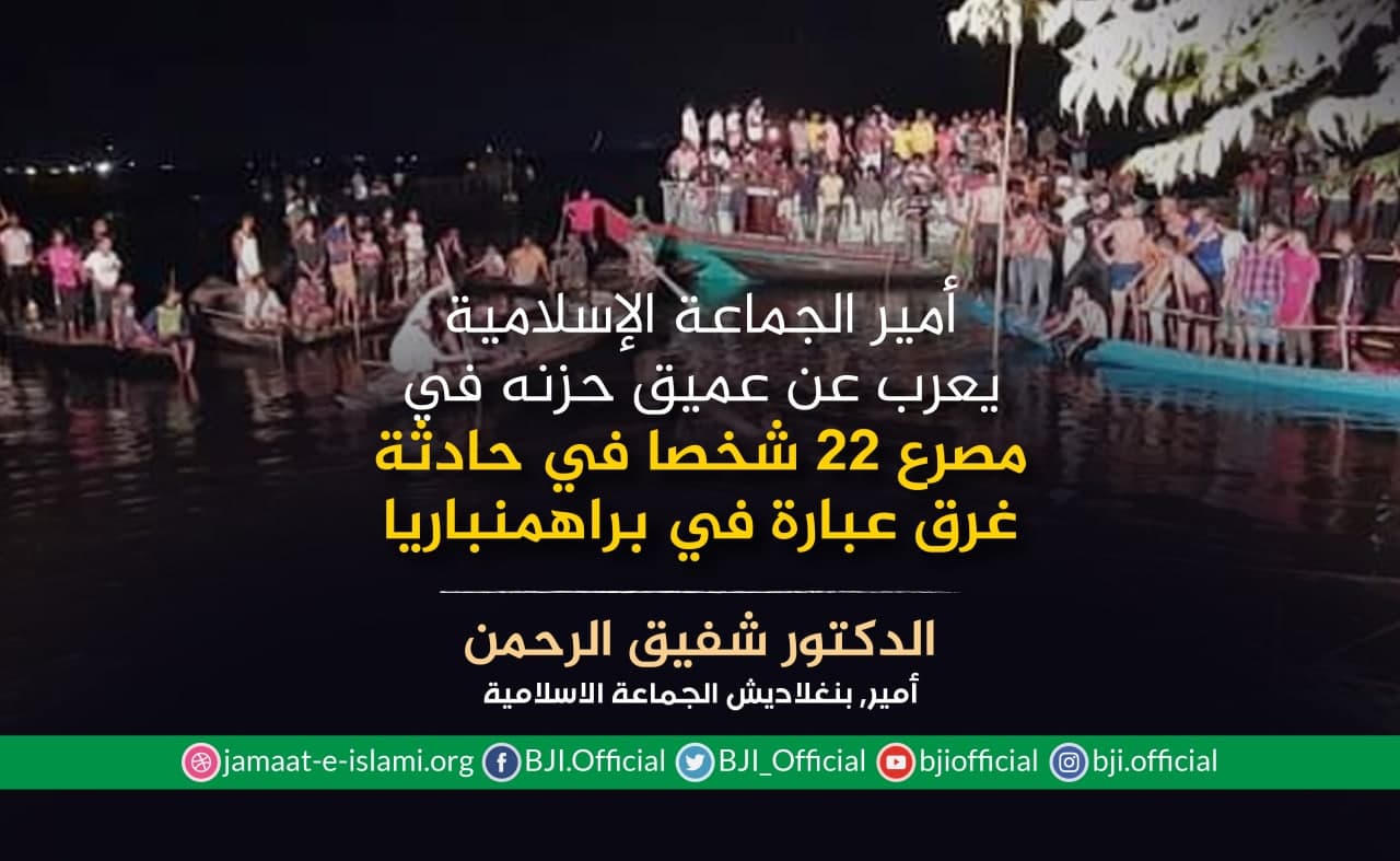 أصدر أمير الجماعة الإسلامية الشيخ الدكتور شفيق الرحمن اليوم الاثنين الموافق لـ29 يونيو 2020 بيانا أعرب فيه عن عميق حزنه ومواساته في وفاة اكثر من 36 شخصا تم انتشال جثثهم من بين 100 راكب كانوا على متن قارب صغير بعد أن اصطدمت بسفينه"مونينغ بارد" كانت تمر في نفس الاتجاه في نهر "بوريغنغا" في البلاد ،مضيفا بأن تقاعس السلطات المعنية وتجاهلها وإهمالها هي السبب الرئيسي في ازدياد حوادث الطرقات النهرية في البلاد
