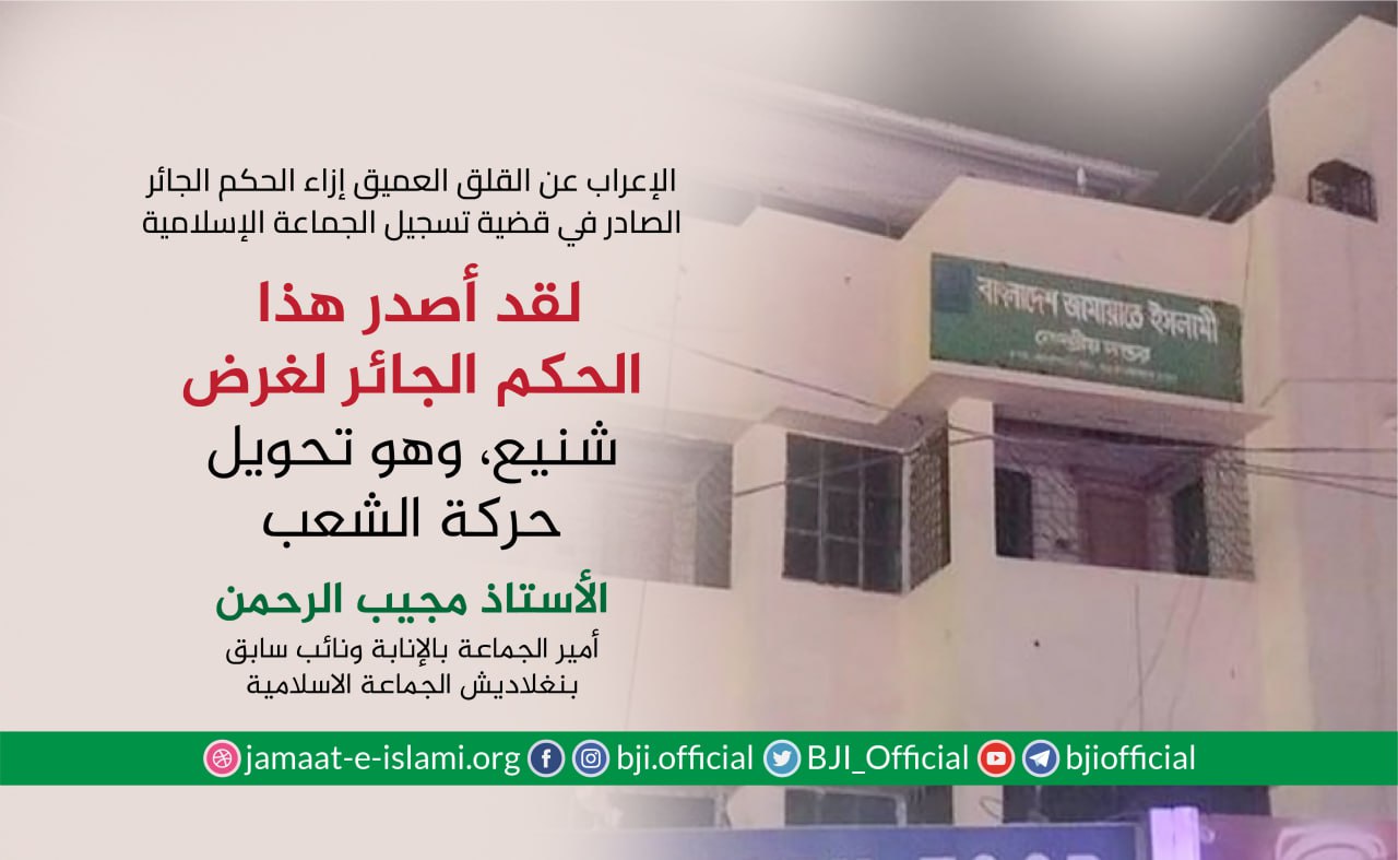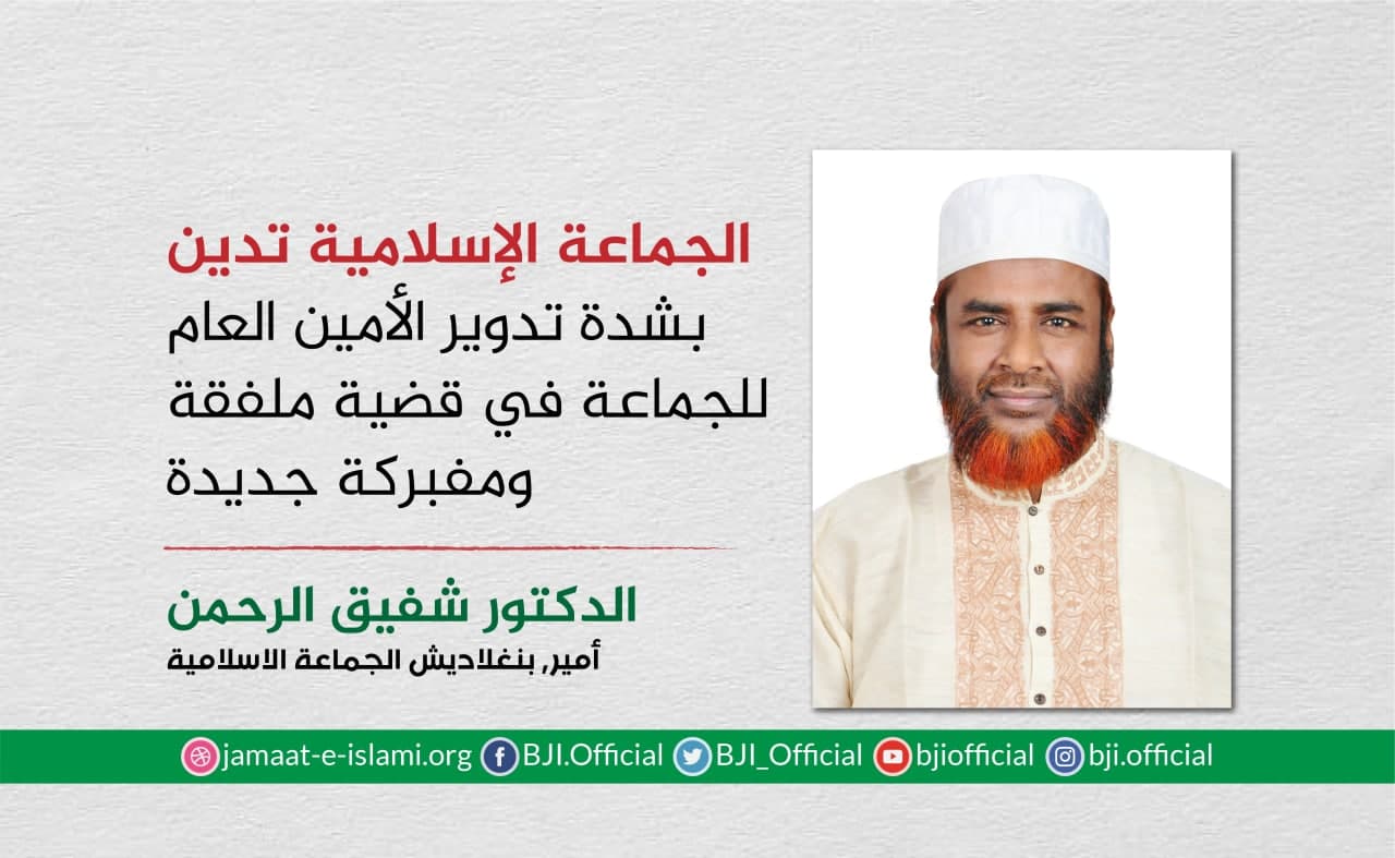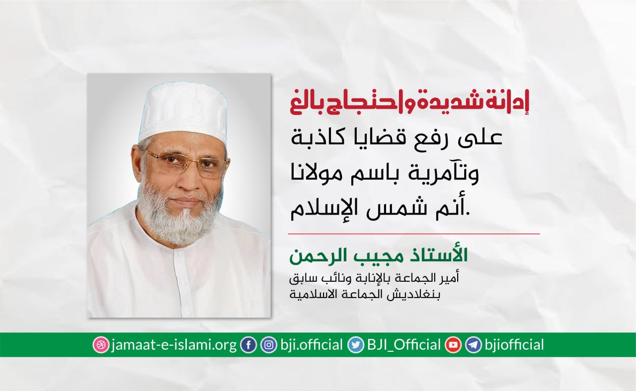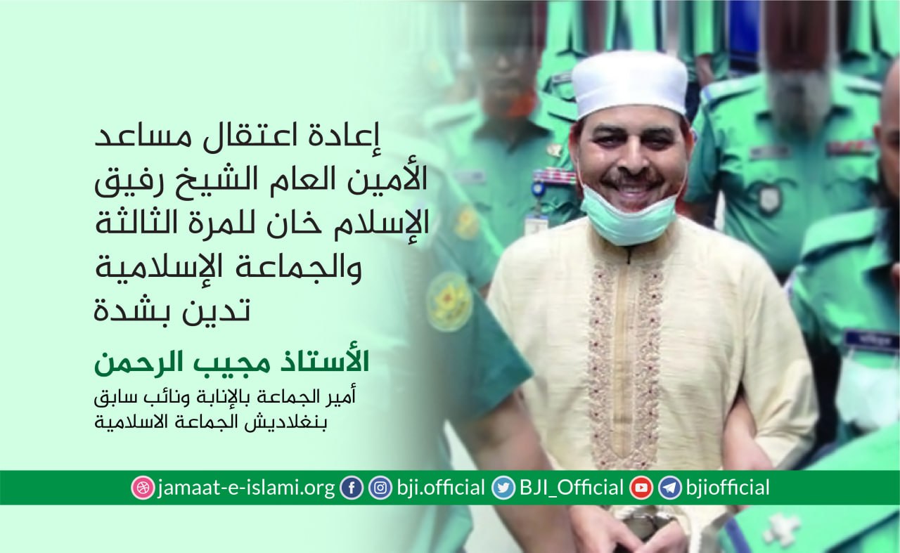 أصدر أمير الجماعة الإسلامية الشيخ الدكتور شفيق الرحمن اليوم الثلاثاء الموافق للأول من سبتمبر 2020 بيانا أدان فيه بشدة اعتقال نائب أمير الجماعة الإسلامية الأستاذ شمس الإسلام وعدد من منسوبي ونشطاء الجماعة الإسلامية من مدينة"شيتاغنج" ،مضيفا بأن الأستاذ شمس الإسلام والقيادي الأستاذ أحسان الله كانوا قد وصلوا المحكمة للمثول أمامها في قضية ملفقة ومفبركة إلا أن المحكمة رفضت تمديد فترة الكفالة وقامت بإلغائها رغم أنهم يتمتعون بكفالة من المحكمة العليا ،مشيرا إلى أن القضية المرفوعة ضدهما ملفقة ومفبركة وعارية عن الصحة تماما ولها أهداف سياسية ، ولم يذهبوا للمحكمة إلا لاحترامهما لهيبة القضاء،مبينا أن المضايقة السياسية هي السبب ...