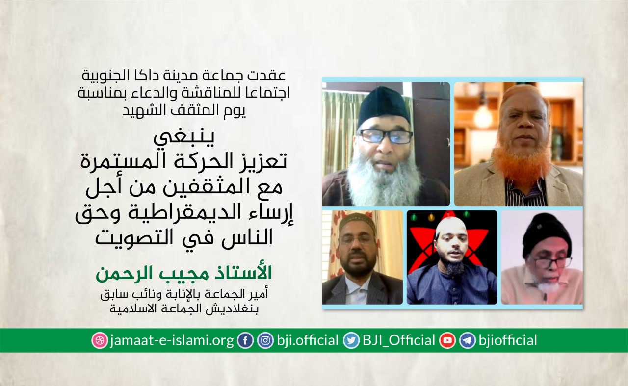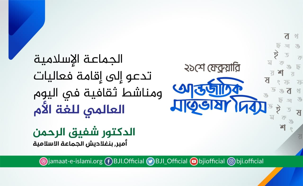 أصدر أمير الجماعة الإسلامية الشيخ الدكتور شفيق الرحمن اليوم الجمعة الموافق لـ19 فبراير 2021 بيانا دعا فيه عموم الشعب إلى إحياء فعاليات اليوم العالمي للغة الأم ويوم الشهداء العظيم الذي يصادف هذا اليوم من كل عام تخليدا لذكرى شهداء اللغة الذين قدموا دماءهم وارواحهم فداءا للوطن في عام 1952 من اجل انتزاع حقهم في التحدث باللغة البنغالية كلغة رسمية للبنغاليين بفعاليات ومناشط ثقافية يليق بهذه المناسبة العظيمة،مضيفا بأن الشعب البنجلاديشي سيتذكر بكل احترام وتقدير وإجلال الابطال البواسل الذين قدموا تضحياتهم من أجل لغتهم الأم،مشيرا إلى أنه يجب علينا أن نحافظ على اللغة البنغالية والثقافة البنغالية من التغريب والغزو ...