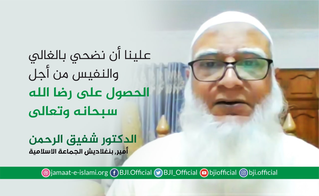 أصدر أمير الجماعة الإسلامية الشيخ الدكتور شفيق الرحمن اليوم الأربعاء الموافق لـ18 يوليو 2021 بيانا هنأ فيه عموم الشعب البنغلاديشي بمناسبة عيد الأضحى المبارك أعاده الله علينا وعلى الشعب البنغلاديشي والأمة الإسلامية باليمن والخير والبركات