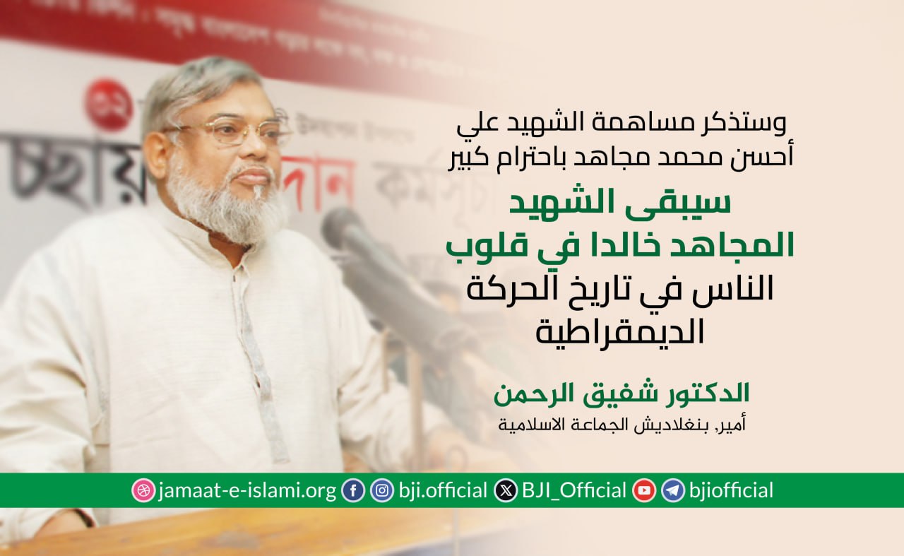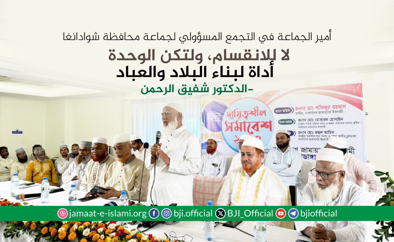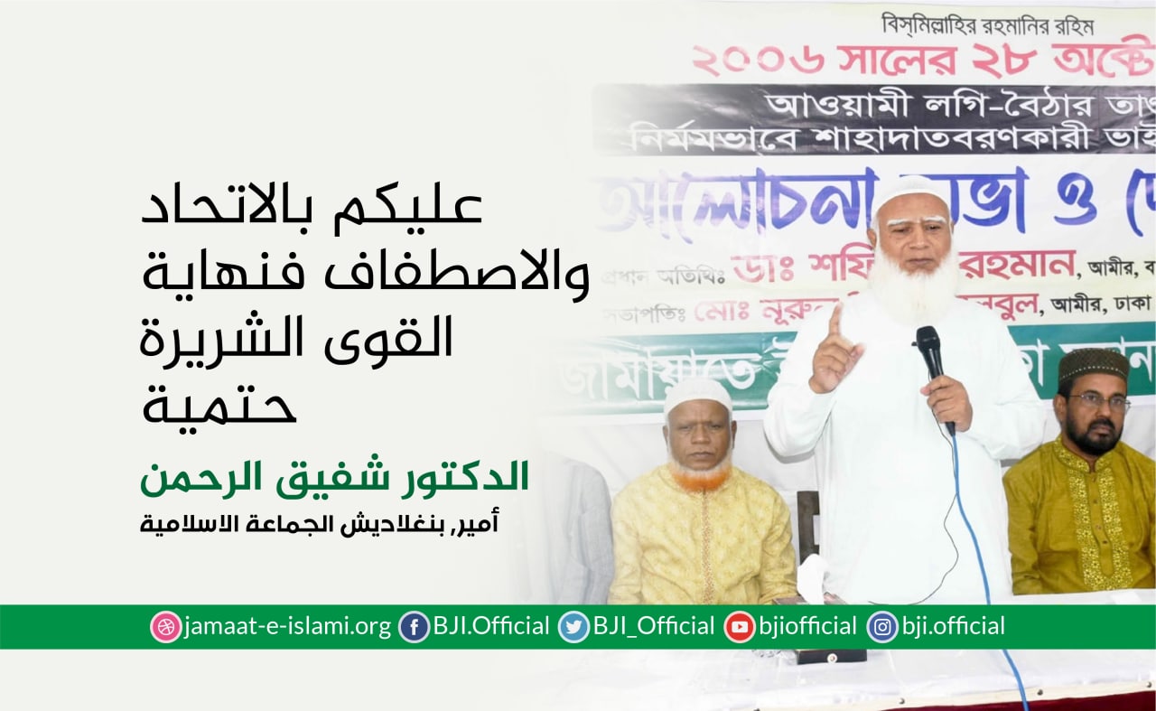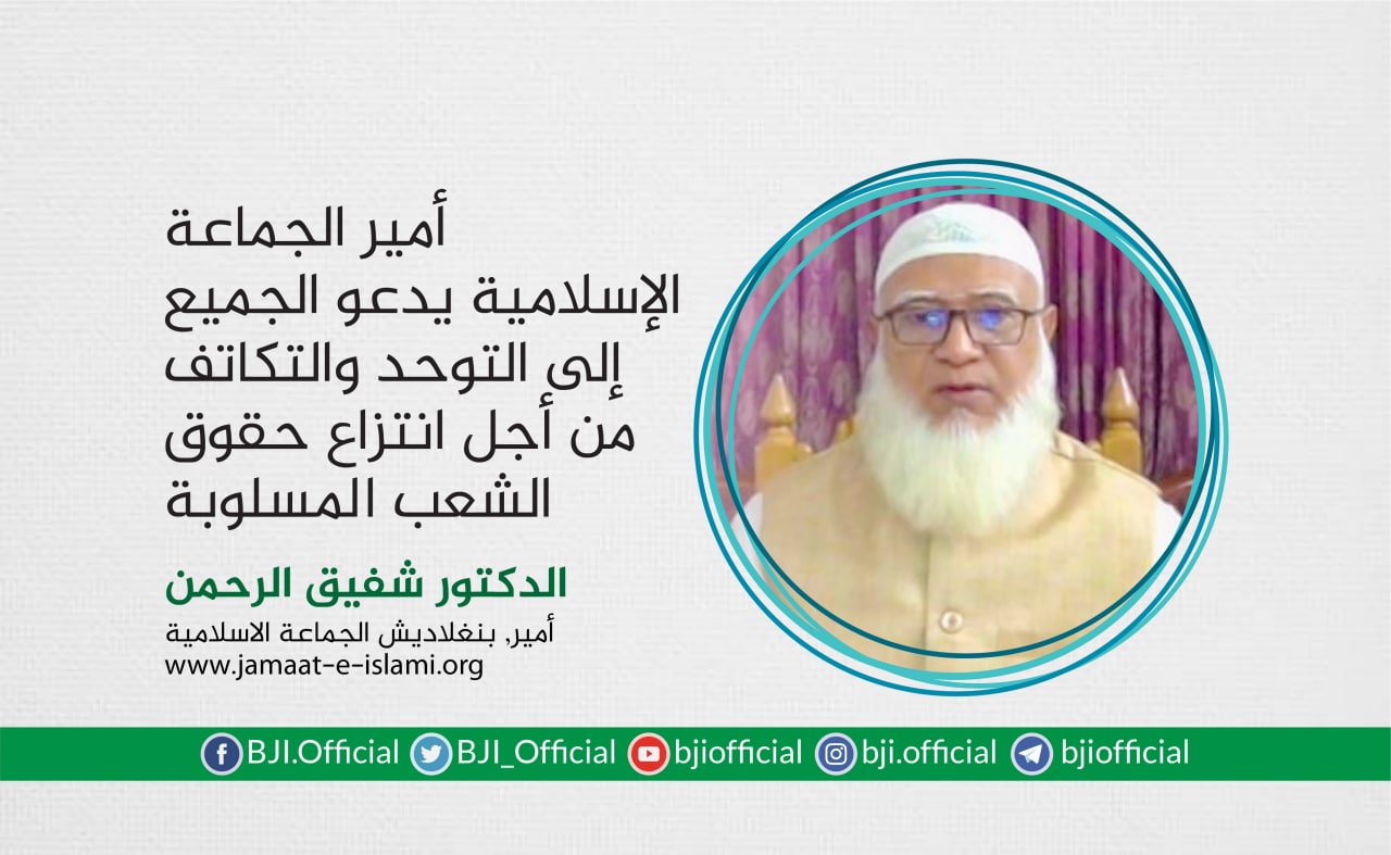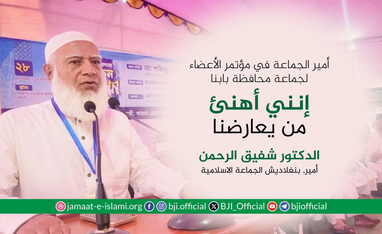 أكد أمير الجماعة الإسلامية في بنغلاديش الدكتور شفيق الرحمن أن الجماعة ماضية في نضالها وجهادها الدؤوب لإقامة مجتمع يقوم على دعائم العدل والإنصاف، مشددا على أن مسيرة الكفاح ستظل متواصلة حتى تشرق شمس النصر الموعود وتتحقق الغاية المنشودة