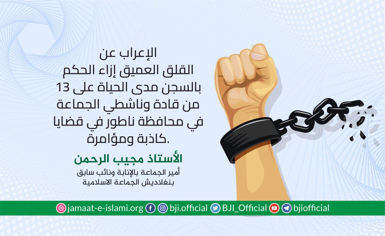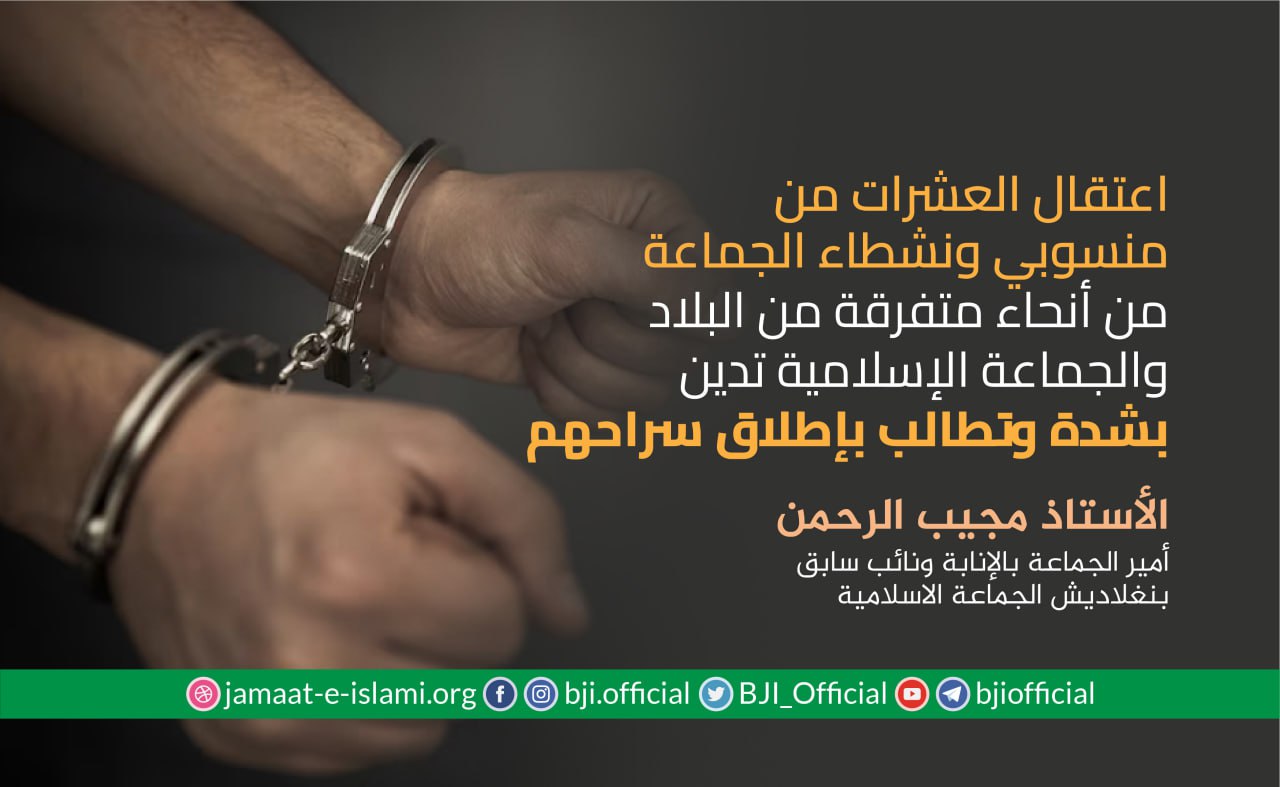 وجاء في البيان إن الحكومة الحالية وبطريقة غير قانونية وغير شرعية تحتجز زعماء الجماعة الإسلامية الكباروعلى رأسهم نائب أمير الجماعة الإسلامية الشيخ العلامة دلاور حسين سعيدي المعتقل منذ عشر سنواتومساعد الأمين العام للجماعة الإسلامية الأستاذ ابو تراب محمد أظهر الإسلام المعتقل منذ ...