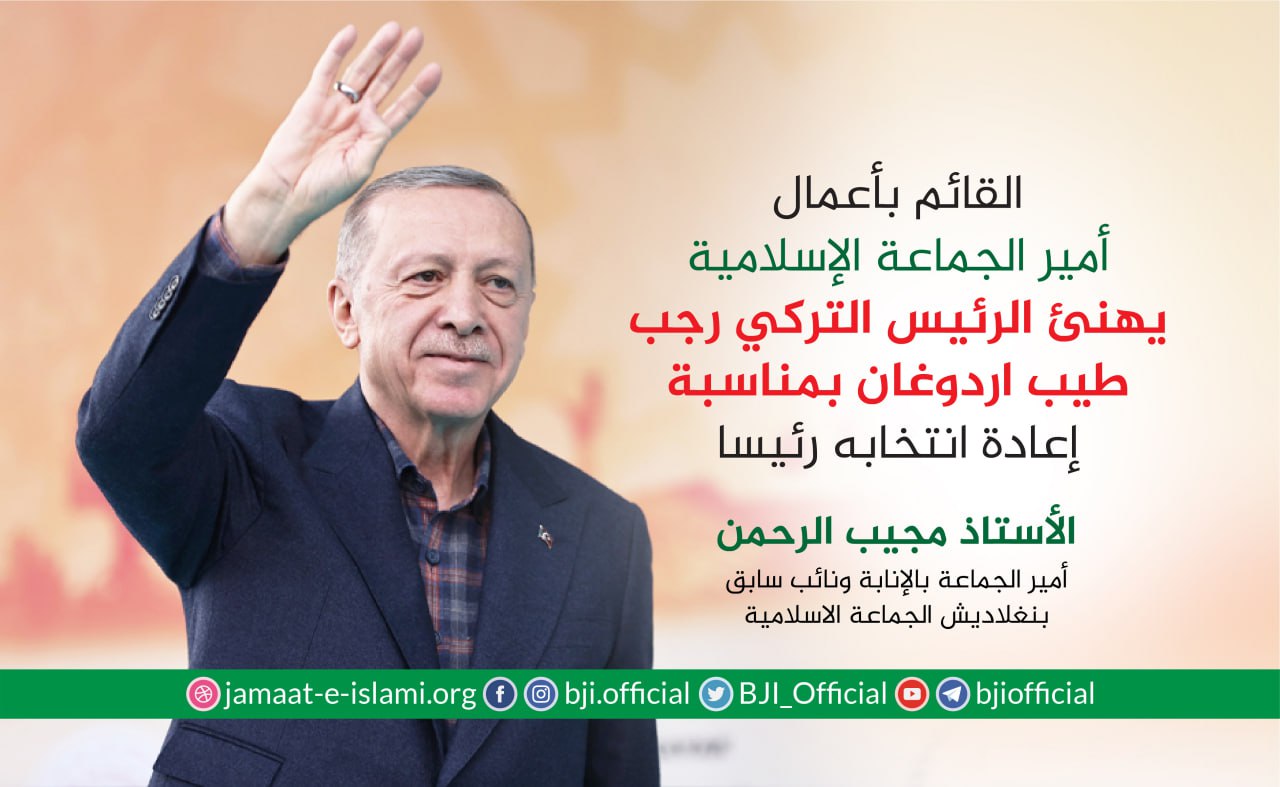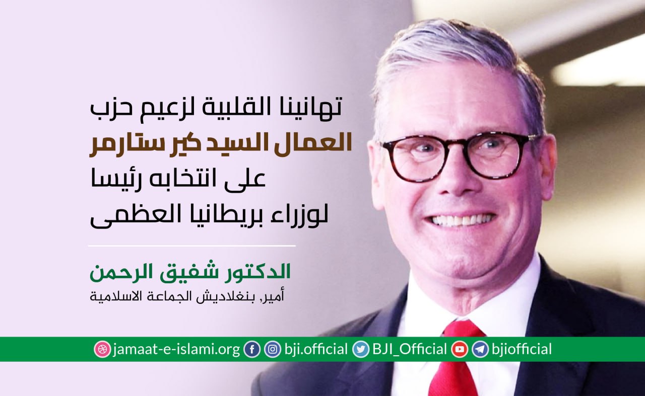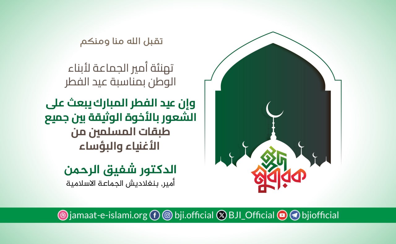أصدر أمير الجماعة الاسلامية الشيخ الدكتور شفيق الرحمن اليوم الجمعة الموافق لـ22 /5/2020 بيانا هنأ فيه الشعب البنجلاديشي بمناسبة عيد الفطر السعيد حيث جاء في البيان :