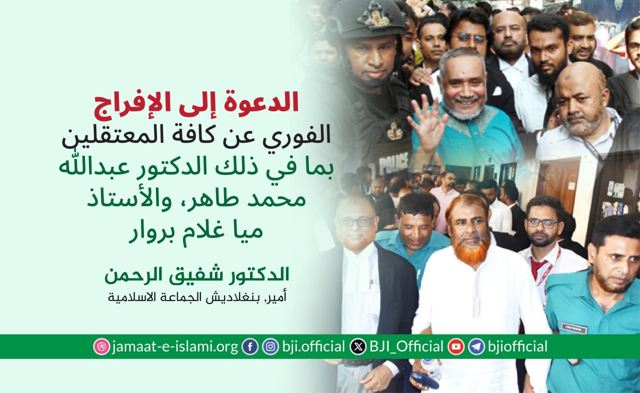 أصدر أمير الجماعة الإسلامية الدكتور الشيخ شفيق الرحمن اليوم الثلاثاء الموافق لـ 17 مارس 2020 بيانا طالب فيه الحكومة بالإفراج الفوري غير المشروط عن مساعد الأمين العام للجماعة الإسلامية الأستاذ أبو تراب محمد أظهر الإسلام الذي يقبع حاليا في السجن منذ تسع سنوات على خلفية الدعوى القضائية المرفوعة ضده بتهمة ارتكاب ما أسمتها الحكومة بجرائم حرب وجرائم ضد الإنسانية بعد ما اعتقلته الحكومة العلمانية المستبدة في سبتمبر 2011. وقد تعرض لتعذيب جسدي وحشي أثناء فترة احتجازه في تلك الأيام. وفي عام 2012 افرجت عنه المحكمة العليا بكفالة وأُطلق سراحه فيما بعد. ولاحقا داهمت عناصر أمنية منزله واعتقلته للمرة الثانية بعد ...
