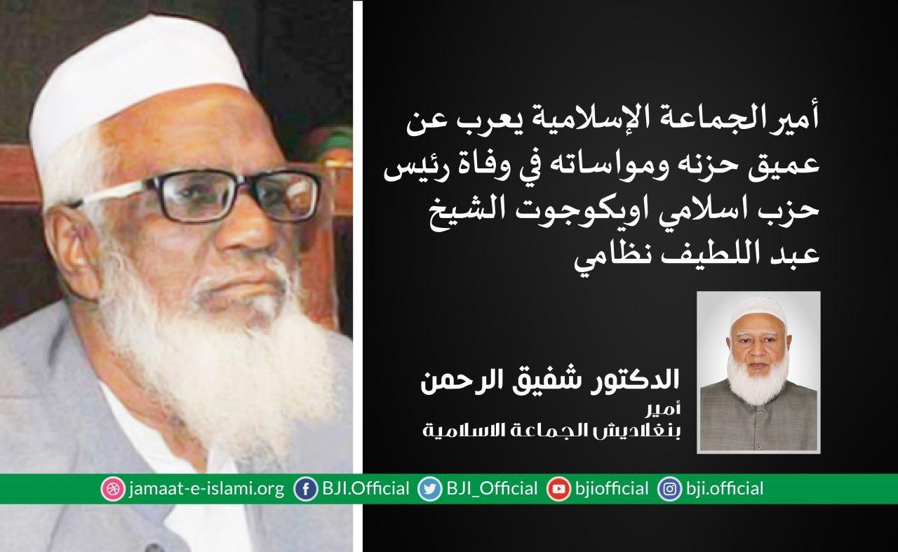 أصدر أمير الجماعة الإسلامية الشيخ الدكتور شفيق الرحمن اليوم الثلاثاء الموافق لـ 12 مايو 2020 بيانا أعرب فيه عن عميق حزنه ومواساته في وفاة السياسي المخضرمورئيس حزبإسلامي اويكوجوت الشيخ عبد اللطيف نظامي الذي انتقل إلى رحمة الله تعالى يوم أمس الاثنين (إنا لله وإنا إليه راجعون)،مضيفا بأن الفقيد لعب دورا هاما في تأسيس دعائم الحركة الإسلامية في البلاد،وبما أنه كان رئيسا للحزب وأحد الشركاء في التحالف الحزبي المعارض لعب دورا بارزا ومحوريا في الحركة الشعبية لاستعادة الديمقراطية وحقوق التصويت المسلوبة للشعب ،وكان الشيخ عبد اللطيف نظامي يتمتع بمهارات في عدة مجالات منها الصحافة والأدب ،وكان محررا وناشرا لصحيفة "داينيك ساركار" ...