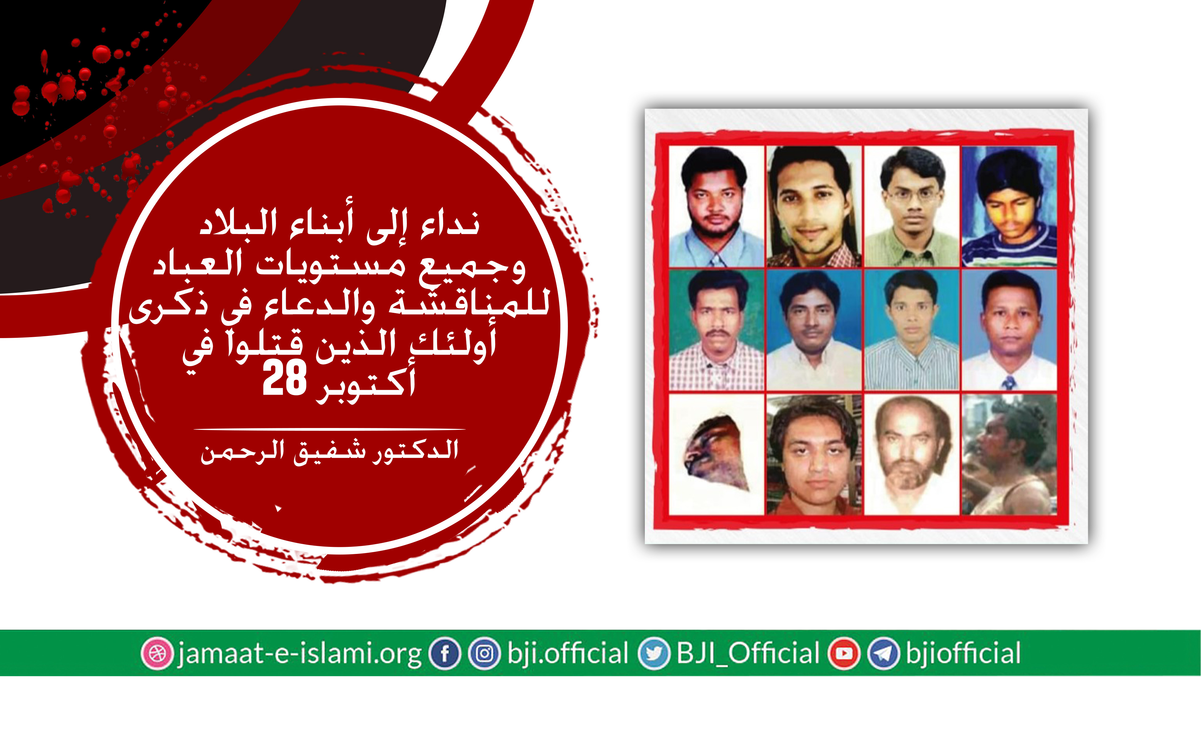أصدر أمير الجماعة الإسلامية الشيخ الدكتور شفيق الرحمن اليوم الثلاثاء الموافق 27 أكتوبر 2020 بيانا دعا فيه عموم الشعب إلى إقامة حفلات دعاء وترحم على أرواح شهداء مذبحة 28 أكتوبر 2006 والذي يصادف يوم غد الأربعاء في جميع أنحاء البلاد