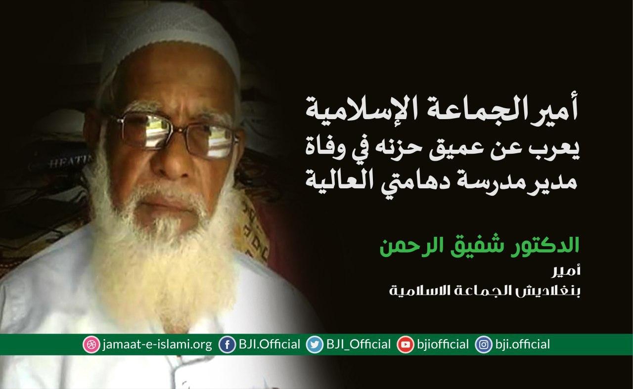 أصدر أمير الجماعة الإسلامية الشيخ الدكتور شفيق الرحمن اليوم الأربعاء الموافق لـ2 سبتمبر 2020 بيانا أعرب فيه عن عميق حزنه ومواساته في وفاة مدير مدرسة وجامعة دامتي العالية شيخ الحديث وأستاذ العلماء العلامة عبد الحليم الذي انتقل إلى رحمة الله تعالى ظهر اليوم (إنا لله وإنا إليه راجعون)،مضيفا بأن الشيخ عبد الحليم الملقب بأستاذ العلماء كان مديرا عاما لمدرسة دهامتي العالية لثلاثين سنة،مبينا أنه لعب دورا كبيرا في نشر التعليم الإسلامي في ربوع بنغلاديش،وعلى هذا سيتذكره الشعب البنغلاديشي بكل احترام وتقدير ،موضحا أنه بوفاته فقدت الدولة واحدا من علمائها الأجلاء الذين ضحو من أجل نشر التعاليم الإسلامية السمحة ...