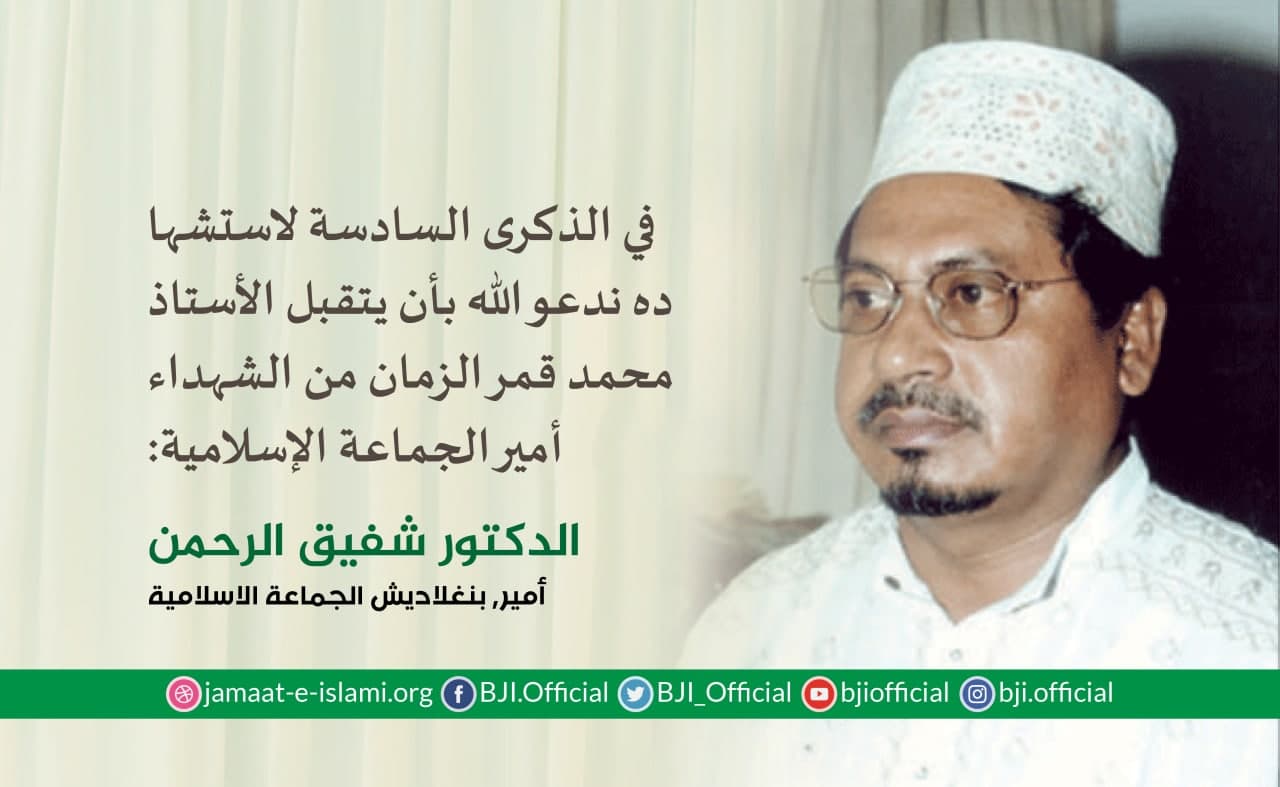 أصدر أمير الجماعة الإسلامية الشيخ الدكتور شفيق الرحمن اليوم السبت الموافق لـ10 إبريل 2021بيانا دعا فيه جميع منسوبي ونشطاء الجماعة الإسامية إلى إحياء فعاليات دينية وسياسية وثقافية في الذكرى السادسة لاستشهاد كبير مساعدي الأمين العام للجماعة الإسلامية والكاتب والصحفي والمفكر الإسلامي المعروف السيد محمد قمر الزمان الذي اعدمته الحكومة الطاغية المستبدة في 11 إبريل 2015 بعد أن أيدت محكمة الاستئناف حكم الاعدام الصادر بحقه من المحكمة العليا في القضية الملفقة والمفبركة المرفوعة ضده بارتكابه بما يسمى بجرائم حرب وجرائم ضد الانسانية .