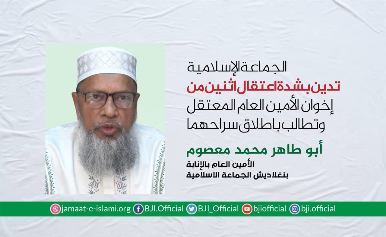 الجماعة الإسلامية تدين بشدة اعتقال اثنين من إخوان الأمين العام المعتقل وتطالب باطلاق سراحهما
