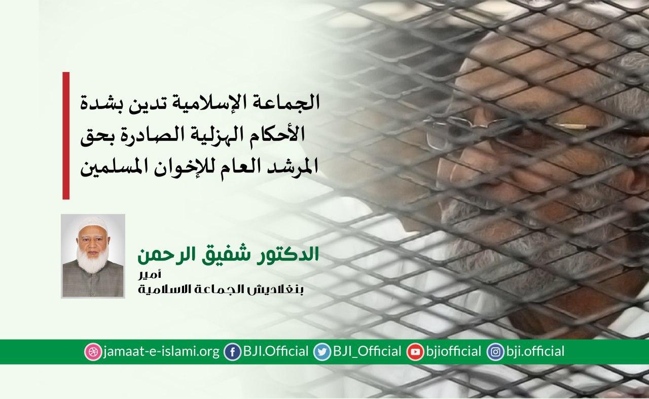 الجماعة الإسلامية تدين بشدة الأحكام الهزلية الصادرة بحق المرشد العام للإخوان المسلمين