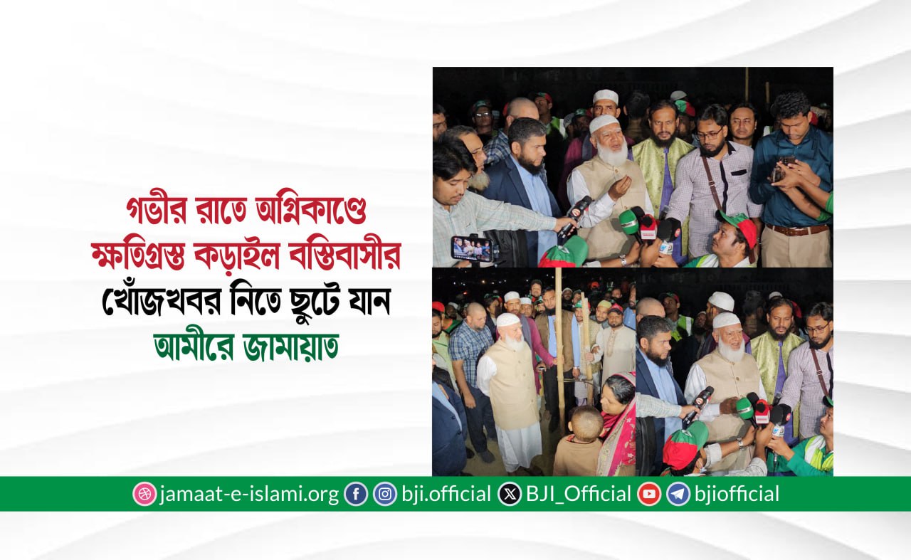 গতকাল ২৫ নভেম্বর (মঙ্গলবার) রাত ১১:৩০টার দিকে বাংলাদেশ জামায়াতে ইসলামী’র আমীর ডা. শফিকুর রহমান রাজধানীর কড়াইল বস্তিতে ভয়াবহ অগ্নিকাণ্ডে ক্ষতিগ্রস্ত এলাকা পরিদর্শন করেন। তিনি গভীর রাতে ঘটনাস্থলে পৌঁছে ক্ষতিগ্রস্ত পরিবারগুলোর সঙ্গে কথা বলেন, তাদের খোঁজ-খবর নেন এবং সামগ্রিক ক্ষয়ক্ষতির বিষয়ে অবহিত হন।