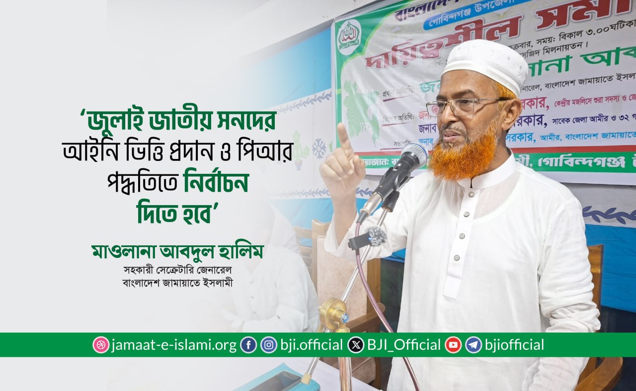 বাংলাদেশ জামায়াতে ইসলামীর সহকারী সেক্রেটারি জেনারেল মাওলানা আবদুল হালিম বলেন, “মানুষের মৌলিক অধিকার রক্ষাসহ ইসলামের অনুশাসন প্রচার ও প্রতিষ্ঠায় সদস্য ...