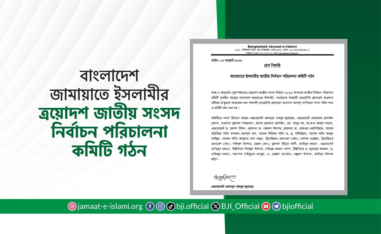 আজ ৮ জানুয়ারি (বৃহস্পতিবার) ত্রয়োদশ জাতীয় সংসদ নির্বাচন ২০২৬ উপলক্ষে জাতীয় নির্বাচন পরিচালনা কমিটি পুনর্গঠন করেছে বাংলাদেশ জামায়াতে ইসলামী। সংগঠনের ...