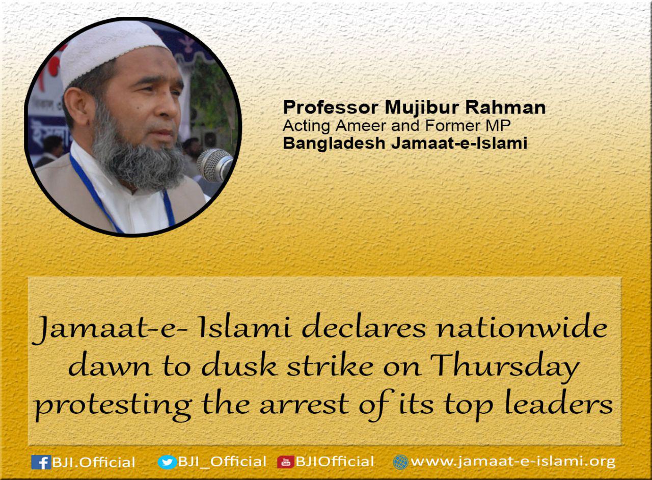 Jamaat-e-Islami declares nationwide dawn to dusk strike on Thursday protesting the arrest of its top leaders