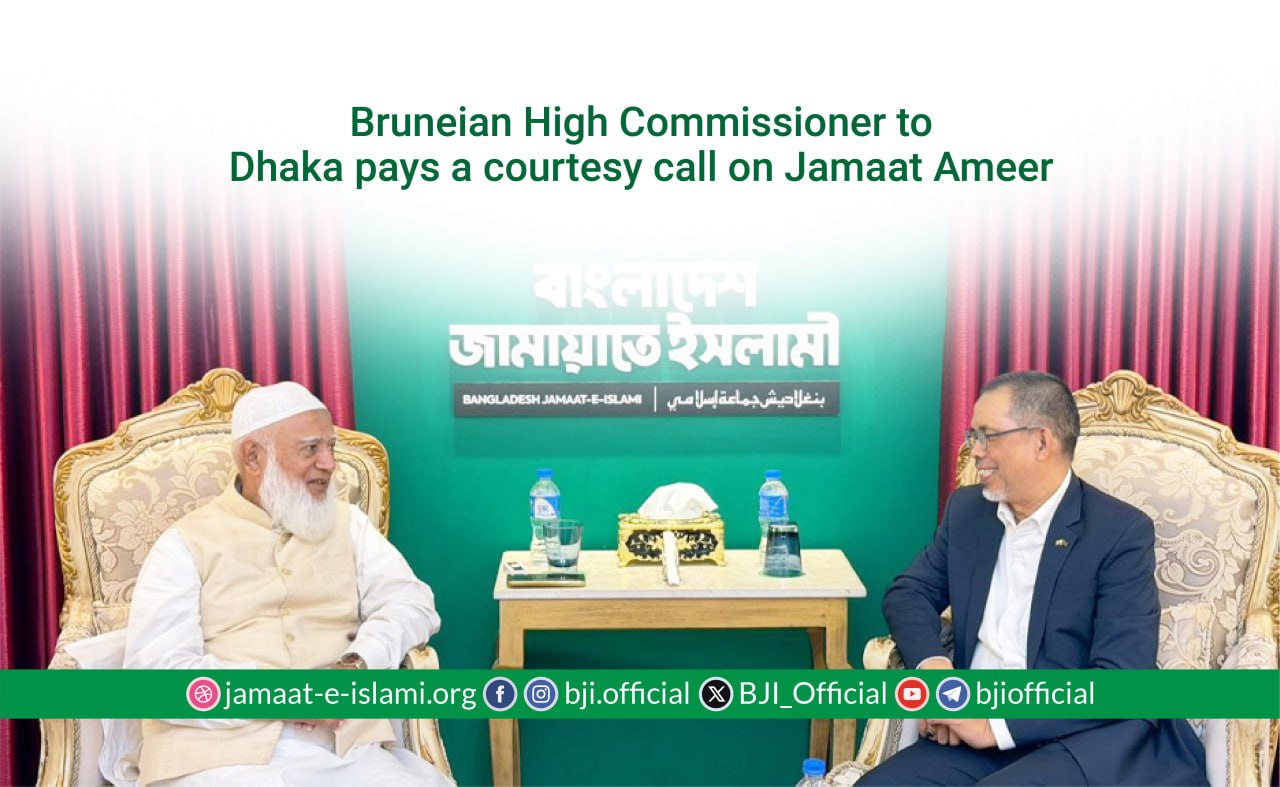 Today, 8 December (Monday) at 9:00 AM, Bangladesh Jamaat-e-Islami's Ameer Dr. Shafiqur Rahman was paid a courtesy call at his Bashundhara office by His Excellency Haji Haris bin Othman, the Bruneian High Commissioner to Dhaka. At that time, he was accompanied by Mr. Rozaimi Abdullah, the First Secretary of the High Commission.