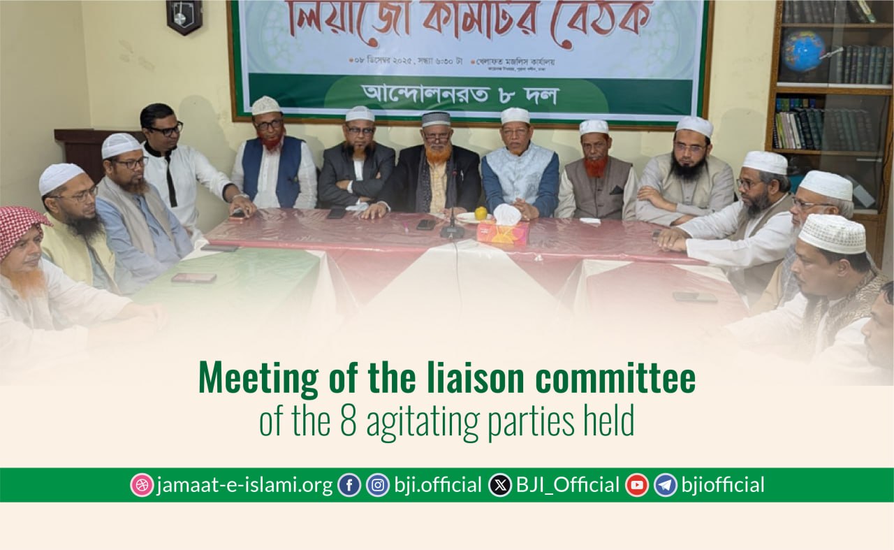 Among others, Bangladesh Jamaat-e-Islami’s Assistant Secretary General and Coordinator of the 8-Party Liaison Committee and former MP Dr. Hamidur Rahman Azad; Secretary General of Islami Andolan Bangladesh Gazi Ataur Rahman; Secretary General of Bangladesh Nezam-e-Islam Party Maulana Musa bin Izhar and Senior Nayeb-e-Ameer Abdul Majed Athari; Secretary General of Bangladesh Khelafat Andolan Maulana Yusuf Sadiq Hakkani; the Nayeb-e-Ameer of Bangladesh Khelafat Andolan Mujibur Rahman Hamidi; the Vice-President and Party Spokesperson of the Jatiya Ganatantrik Party (JAGPA) Engineer Rashed Prodhan; the President of Bangladesh Development Party Advocate A.K.M. Anwarul Islam Chan and its Secretary General Nizamul Haque Nayeem; Joint Secretaries of Islami Andolan Bangladesh Mr. Ashraful Alam and Fazle Bari Masud were present in the meeting.